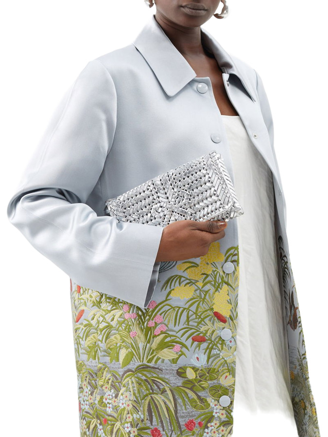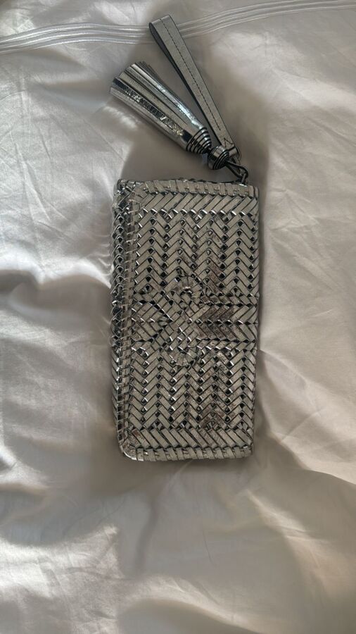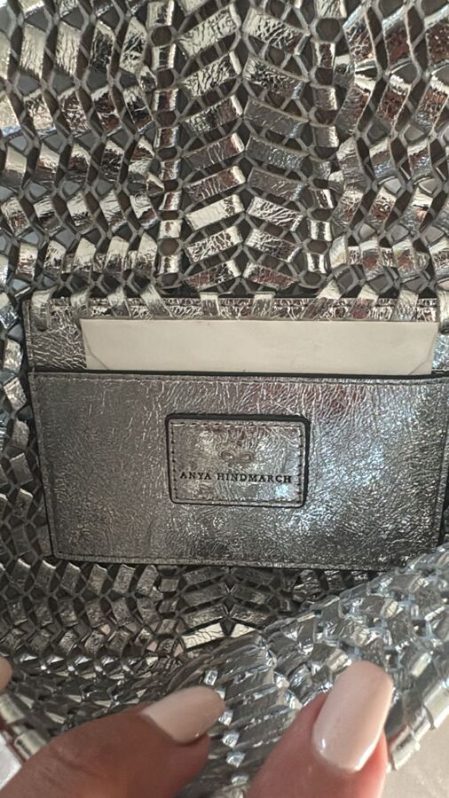 Introducing the Neeson clutch bag by Anya Hindmarch, a stunning piece hand-woven from luxurious gold-tone leather. This exquisite clutch features the brand's iconic woven bow and a chic leather tassel, adding a playful touch to its metallic braided design. Perfect for elevating any evening look, this clutch combines elegance and whimsy, making it a must-have accessory!