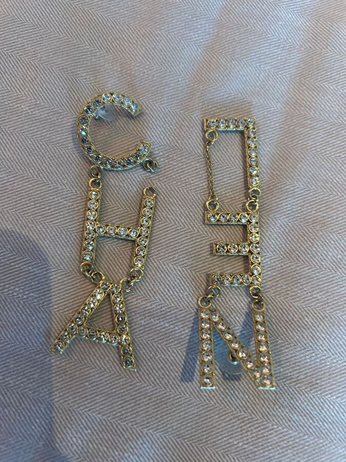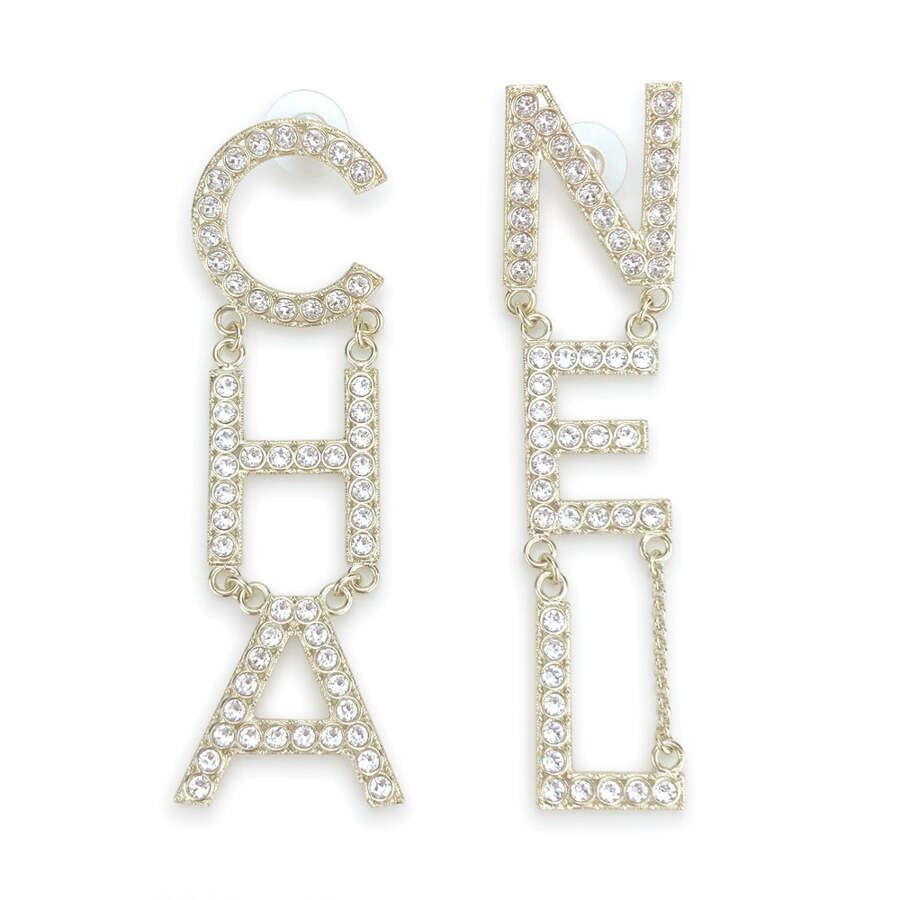 Make a bold statement with these Crystal Letter Logo Dangle Earrings, featuring the iconic “CHA” and “NEL” lettering. The combination of light gold-tone metal and sparkling white crystals creates a stunning accessory that showcases your unique style. Perfect for elevating any outfit!