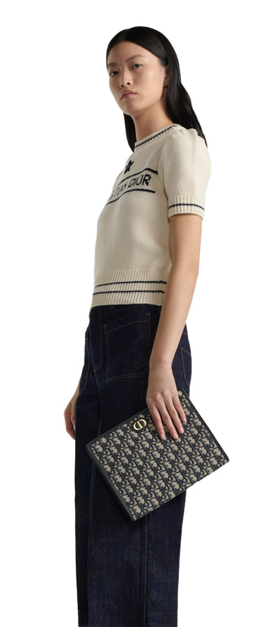 Elevate your accessory game with the 30 Montaigne Dea pouch — a timeless piece crafted from elegant blue Dior Oblique jacquard. Showcasing the iconic CD signature, this sophisticated pouch features a spacious interior with a zip closure, one slip pocket, and three card slots. Versatile enough to carry as a clutch or slip into your Dior Book Tote, it's the perfect blend of style and functionality. Made in Italy, this pouch is a must-have for any fashionista!