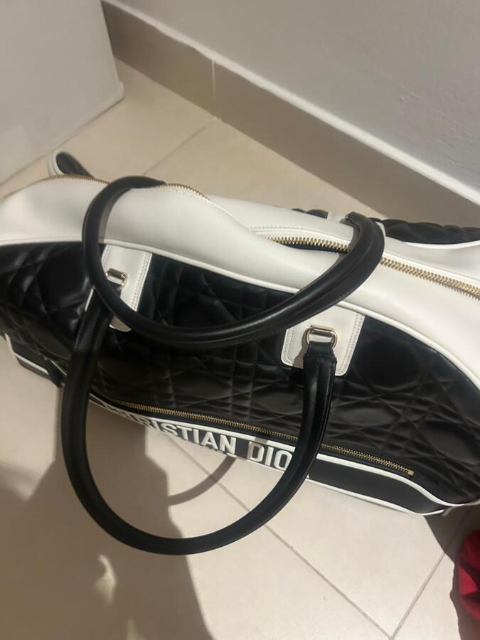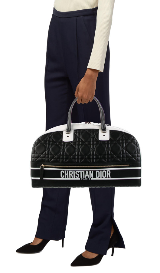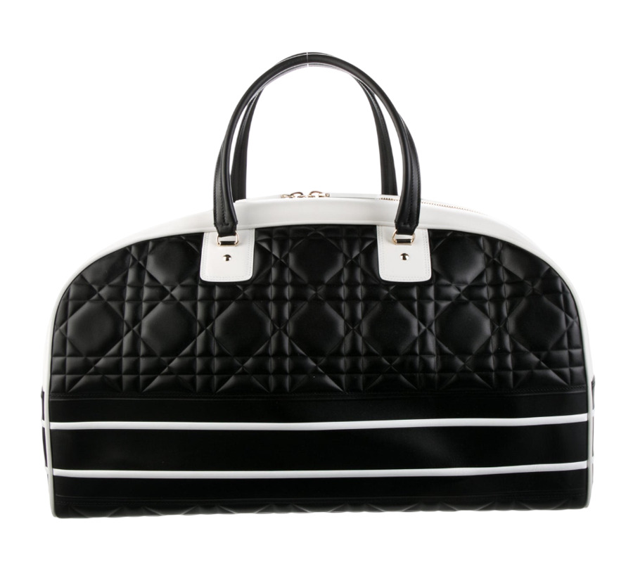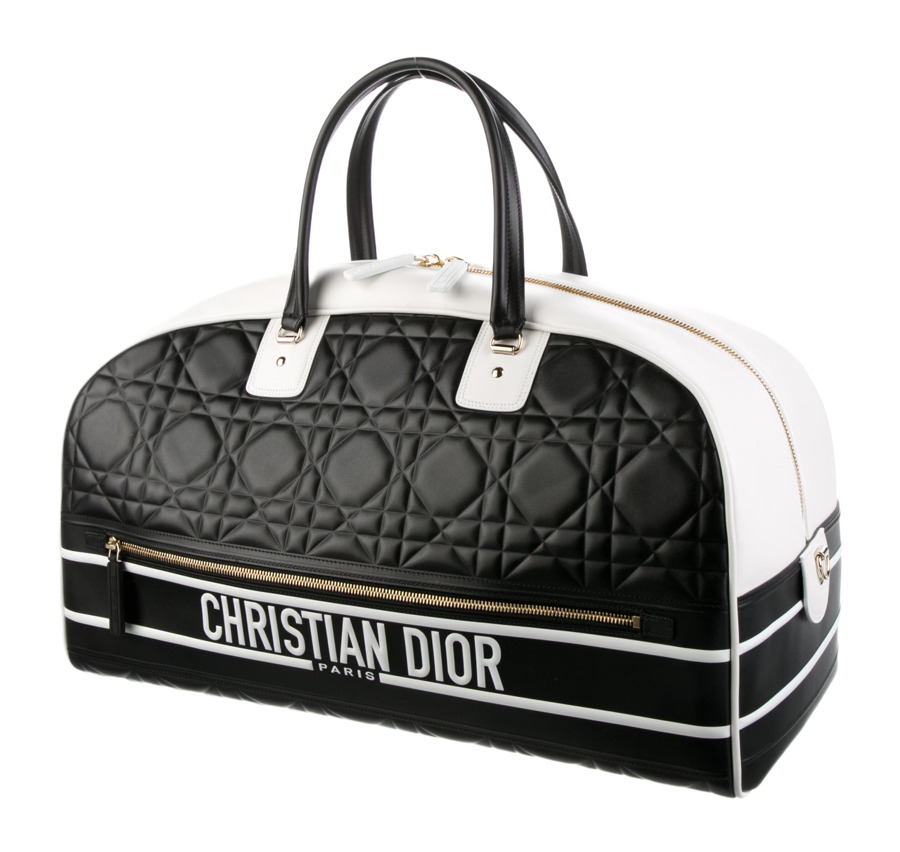 Introducing the Christian Dior Weekender Bag from the 2021 Collection by Maria Grazia Chiuri! This stunning bag features a chic black and white leather design with a signature cannage pattern and luxurious gold-tone hardware. With rolled handles and a single adjustable shoulder strap, it offers versatility for any occasion. The zip closure, single exterior pocket, and dual interior pockets provide ample storage, while protective feet at the base ensure durability.