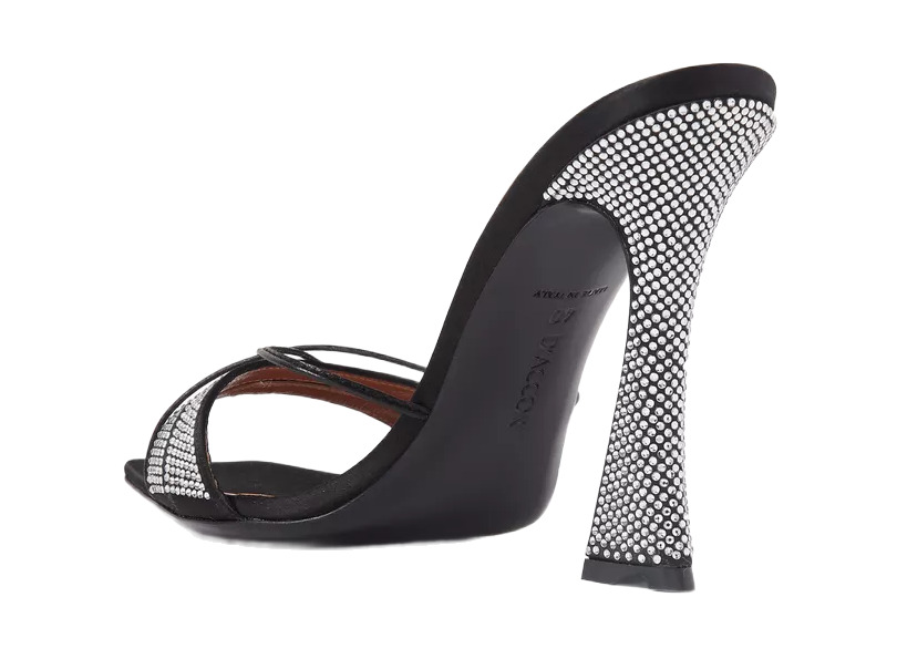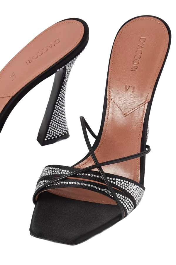 Add maximalist flair to your collection with the Lust mules from D'Accori. Handcrafted in Florence, these stunning mules feature asymmetrical thong straps crafted from crystal-embellished satin. The standout 100mm crystal heel boasts dramatic angular lines, complemented by a square-toe sole for a striking signature look. Perfect for making a bold statement, these mules will elevate any outfit with elegance and style.
