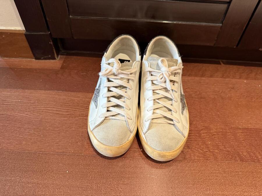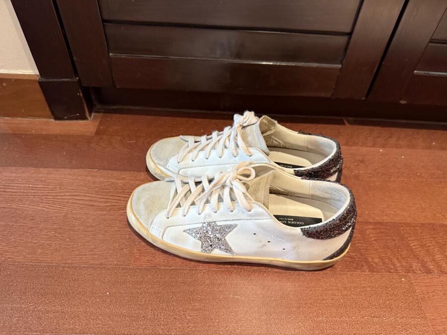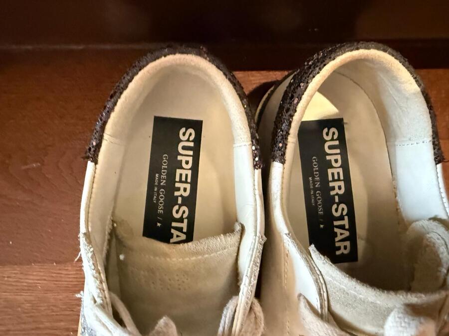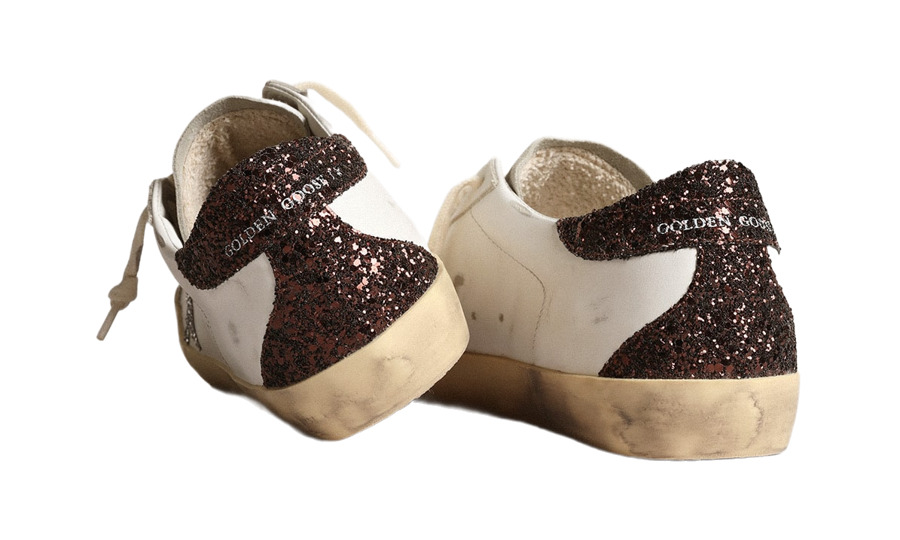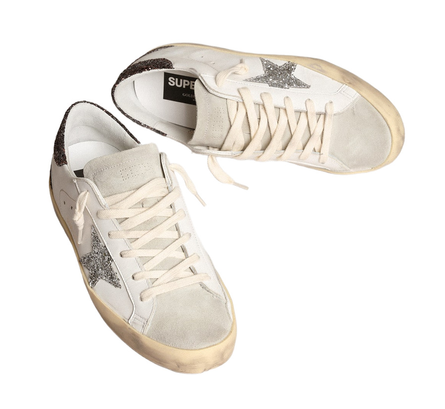 Embrace a timeless classic with a twist in the Golden Goose Super-Star Sneakers. Featuring a white leather upper, these eye-catching kicks showcase a sparkling silver glitter star and a brown glitter heel tab. The brown glitter insert, ice-gray suede tongue, and cream-colored laces provide the perfect finishing touches. With a vintage finish and 100% rubber sole, these handmade sneakers bring Italian craftsmanship to your wardrobe!