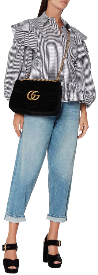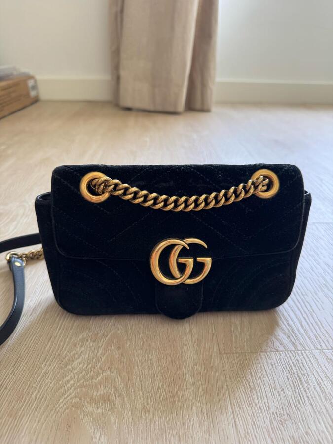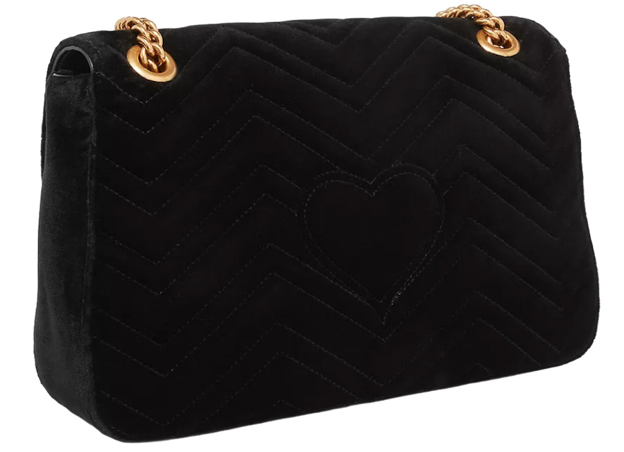 The Black GG Marmont 2.0 Velvet Shoulder Bag is a statement piece that perfectly balances luxury and bold elegance. Crafted in plush black velvet with the iconic GG logo in antique gold, it exudes timeless sophistication. Its structured shape and versatile chain strap make it ideal for both day and night, adding a touch of glamour to any outfit.
