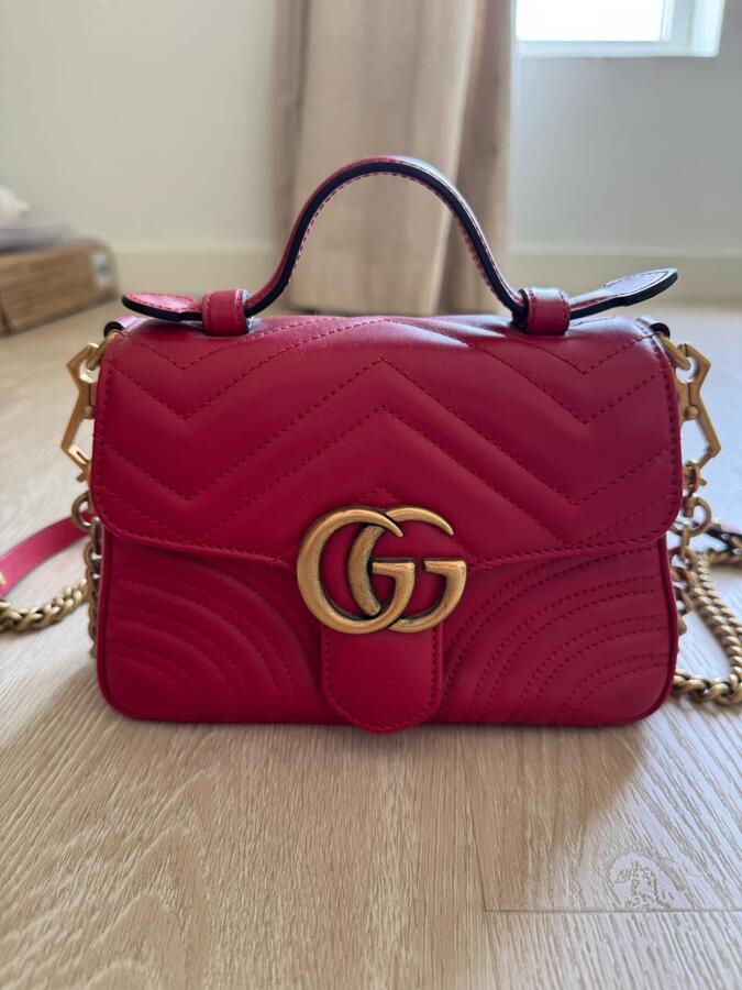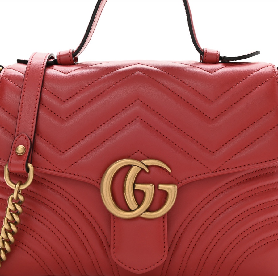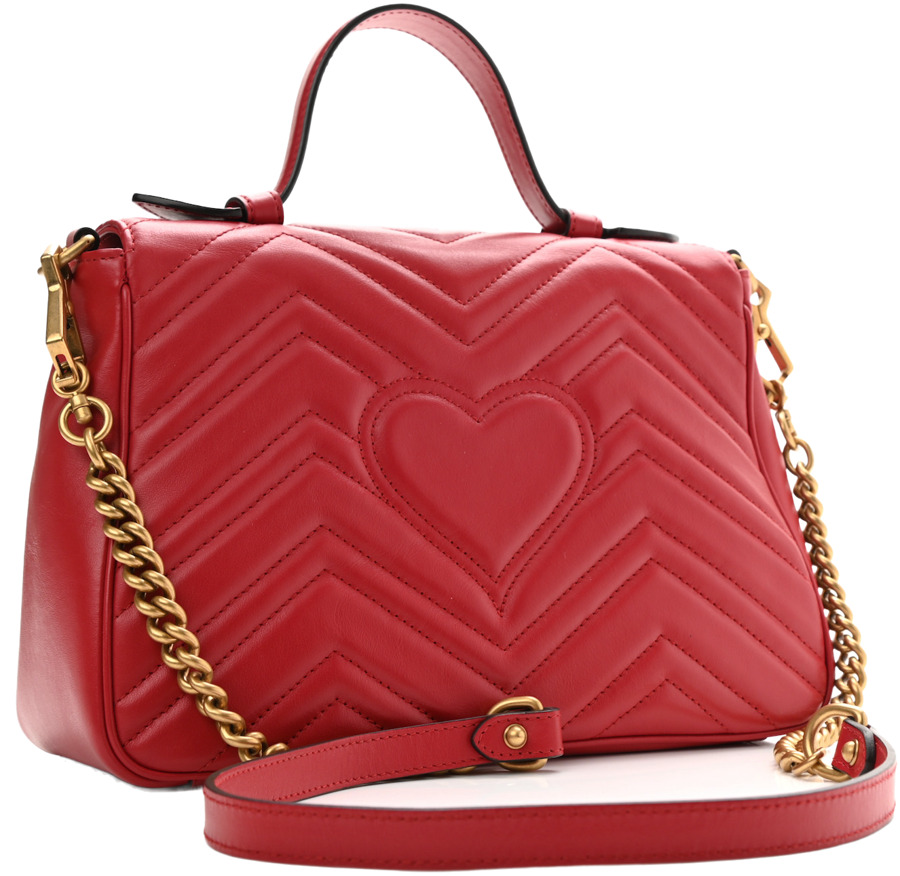 The Calfskin Matelassé Small GG Marmont Top Handle Shoulder Bag in Hibiscus Red is a striking blend of elegance and versatility. Crafted from supple quilted calfskin, it features the iconic GG emblem in antique gold, paired with a chic top handle and chain shoulder strap for multiple styling options. Its bold hibiscus red hue makes it a standout piece, perfect for adding a touch of luxury and confidence to any look.