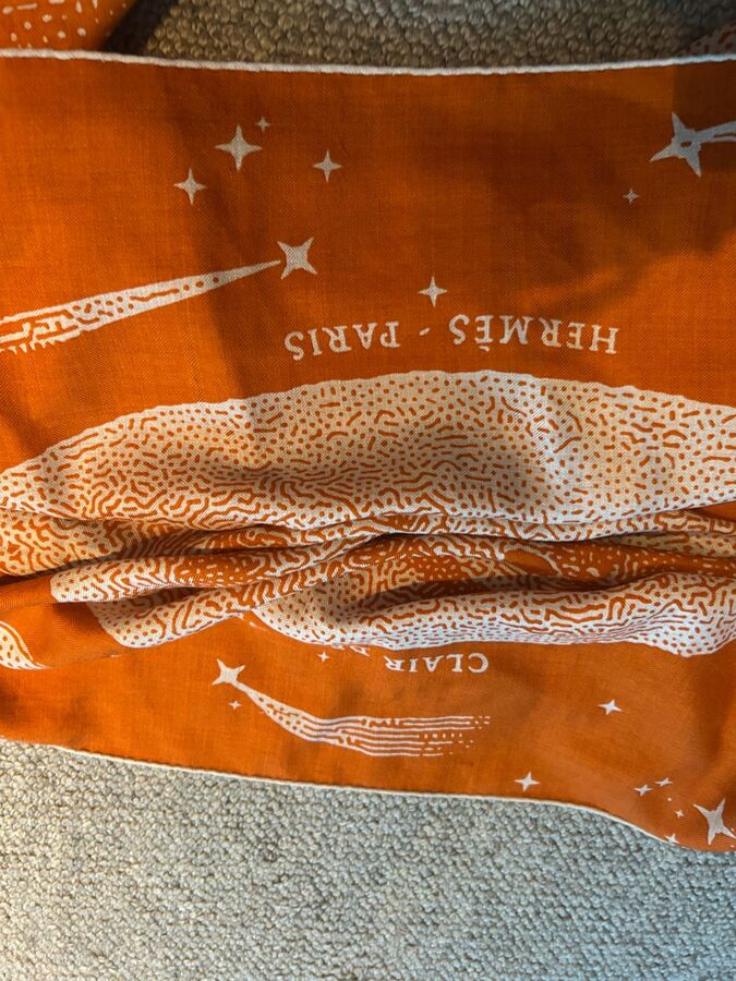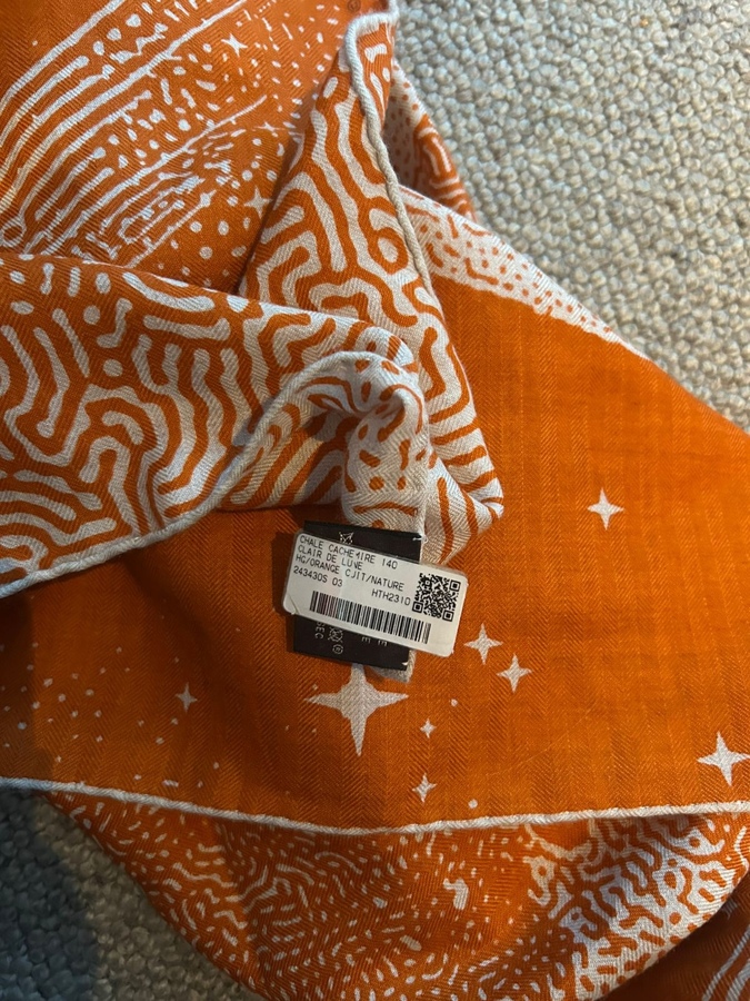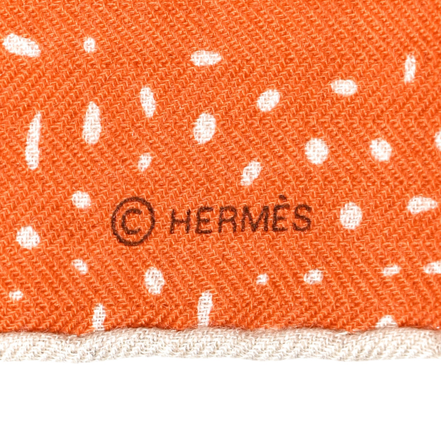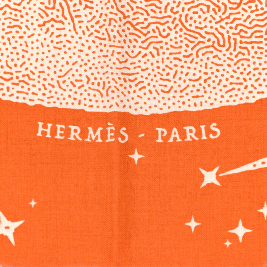 Wrap yourself in luxury with the HERMES Silk Cashmere Clair De Lune Shawl 140 in vibrant orange, cuit, and naturel. Made from a sumptuous blend of 70% cashmere and 30% silk, this stunning scarf showcases a bold orange and beige print adorned with a celestial motif and elegant beige borders. Perfect for adding a touch of glamour to any outfit!