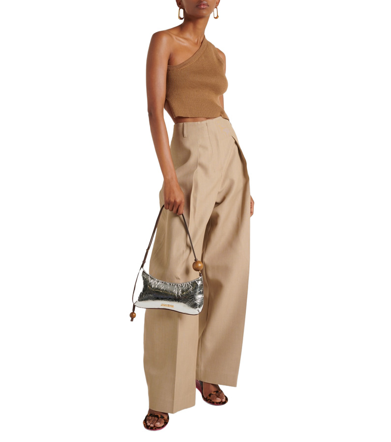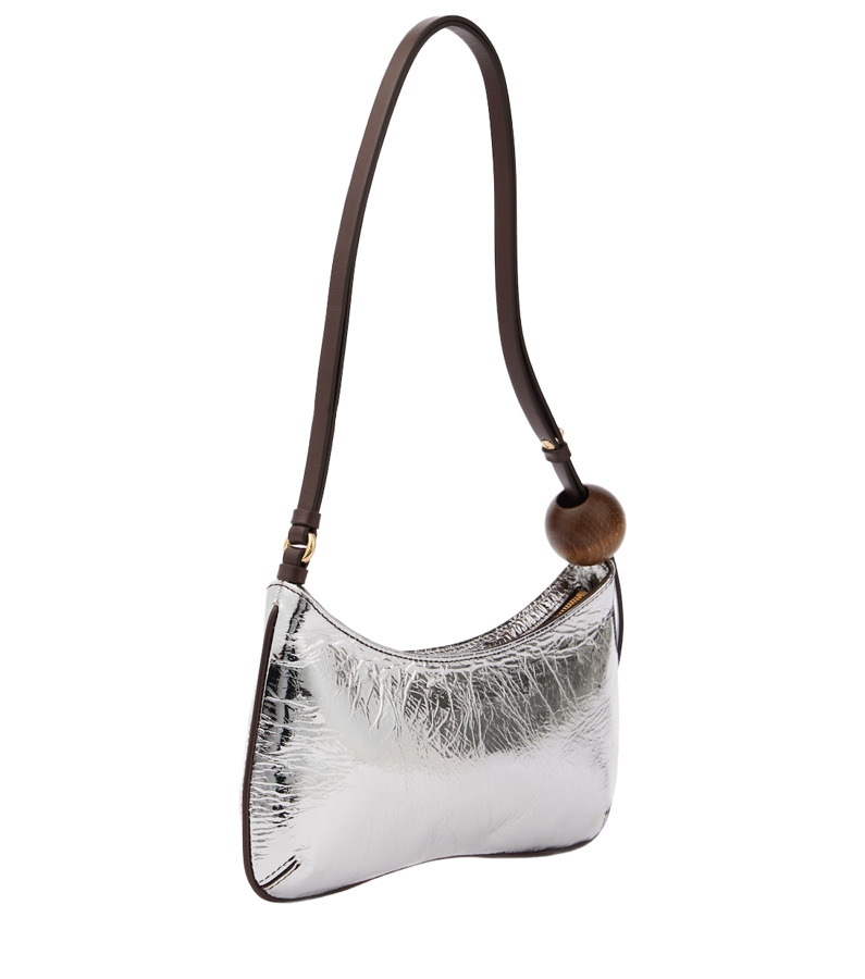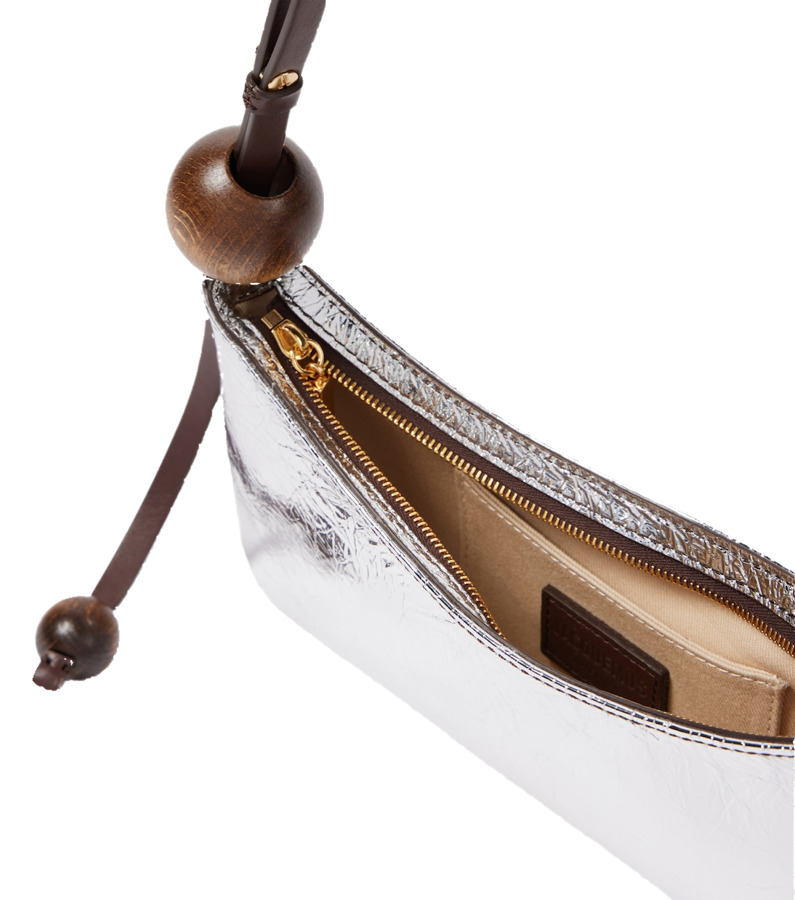 Meet the JACQUEMUS Le Bisou Perle shoulder bag, a striking accessory in metallic leather. Made in Italy, this silver bag boasts a stylish fabric lining and includes an internal slot pocket for easy organization. With its gold hardware and zipped top closure, it exudes luxury, while the adjustable shoulder strap ensures practicality. A perfect blend of elegance and modern style!
