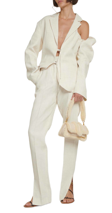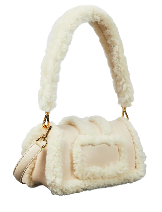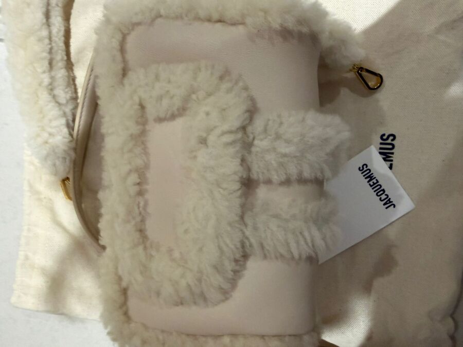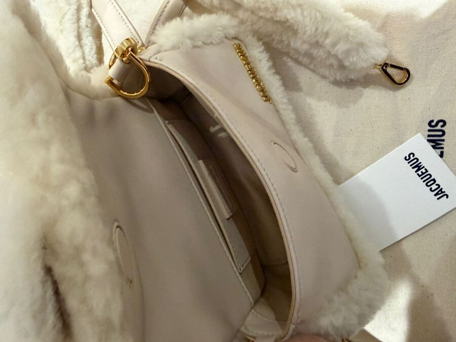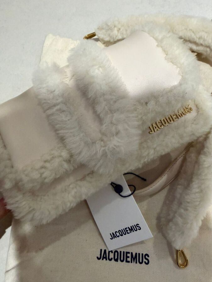 The Jacquemus Le Petit Bambimou Doux shoulder bag is a refined statement in soft luxury. Crafted in Italy from smooth calf leather and plush lambswool, it features a foldover top with magnetic closure, gold-tone logo plaque, and a structured top handle. Finished with a detachable shoulder strap and internal slip pocket for effortless elegance.