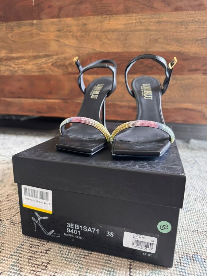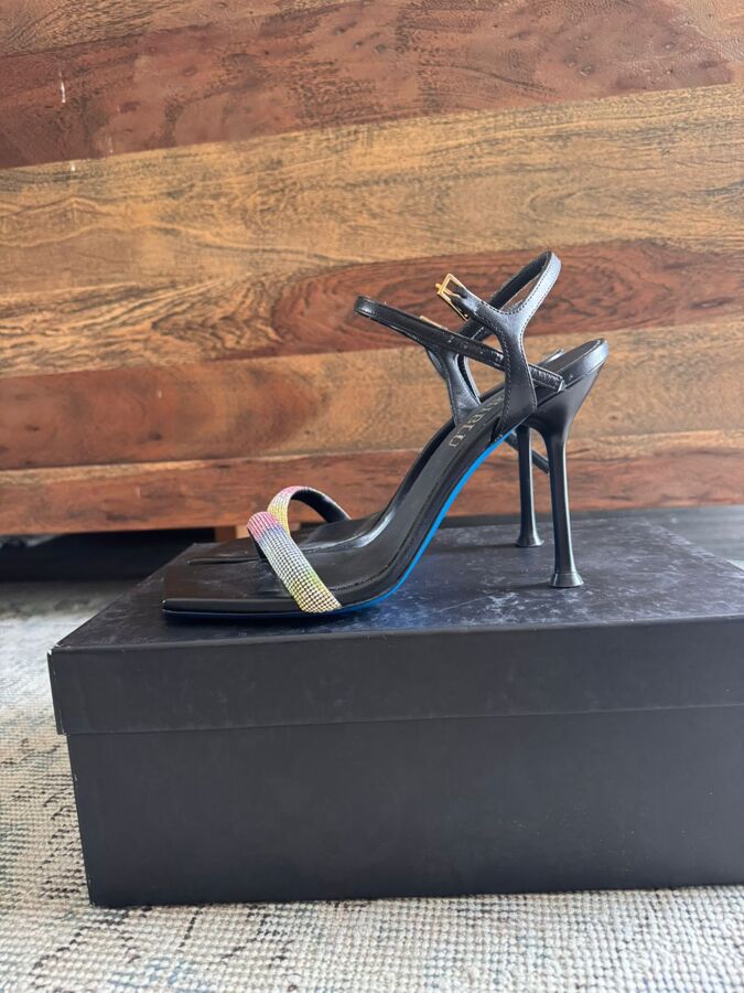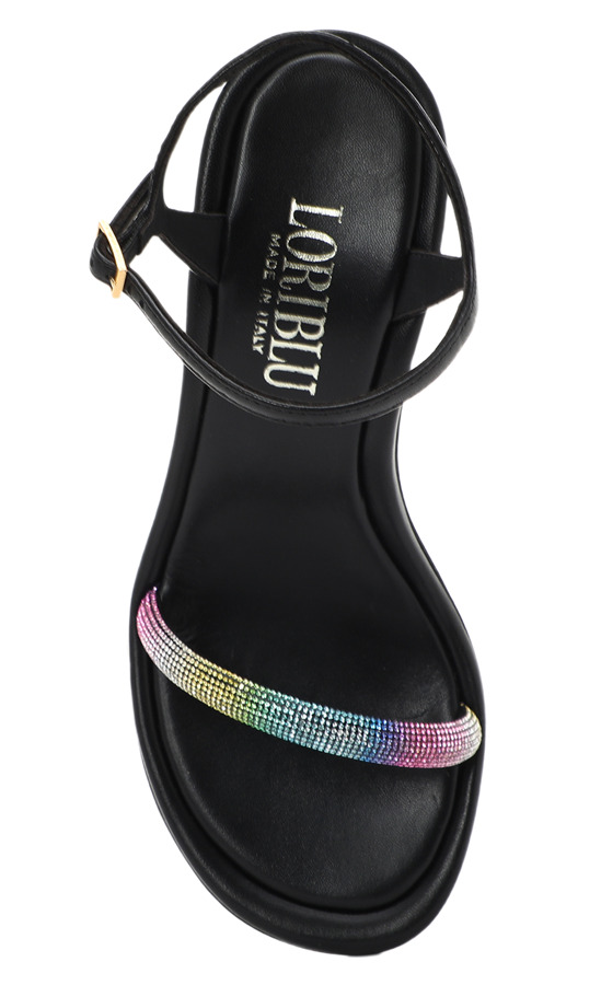 Step into the spotlight with Loriblu's eye-catching sandals! Featuring a sleek black design and a dazzling rainbow rhinestone strap, these stiletto heels scream fabulousness. With an adjustable ankle strap for the perfect fit, they're your go-to for turning heads at any event. Slip them on and let the compliments roll in!