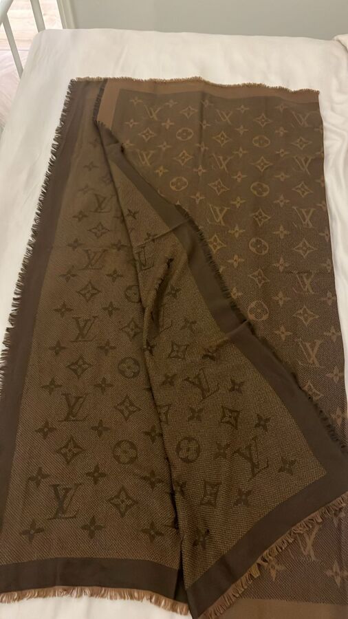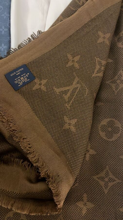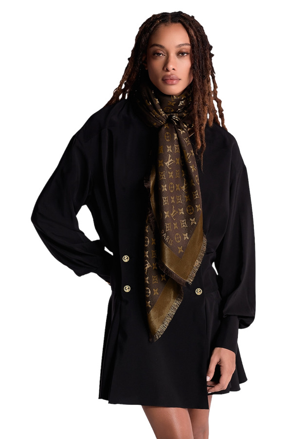 Add a touch of luxe with this Louis Vuitton Monogram Shawl. Woven in a tone-on-tone pattern with subtle shimmer from soft shine yarn, it blends silk, wool, viscose, and polyester for an elegant drape. Finished with the iconic LV Paris signature in lurex, it’s the ultimate statement accessory for elevated style.