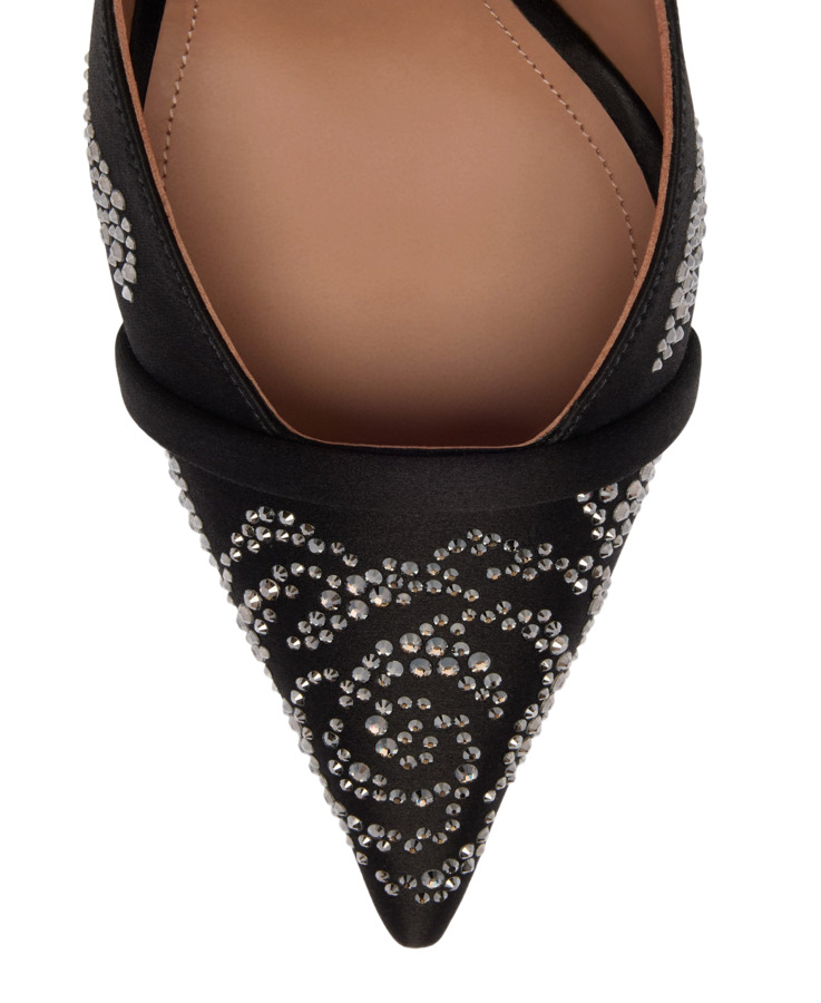 Discover the perfect blend of vintage sophistication and modern allure with the Jazz stiletto slingbacks from Malone Souliers. Crafted in lustrous black satin, they feature dazzling crystal rose embellishments that catch the light beautifully. With a sharply pointed toe and a 90mm stiletto heel, these handmade Italian shoes embody modern glamour. True to size, they're an irresistible addition to your outfit!