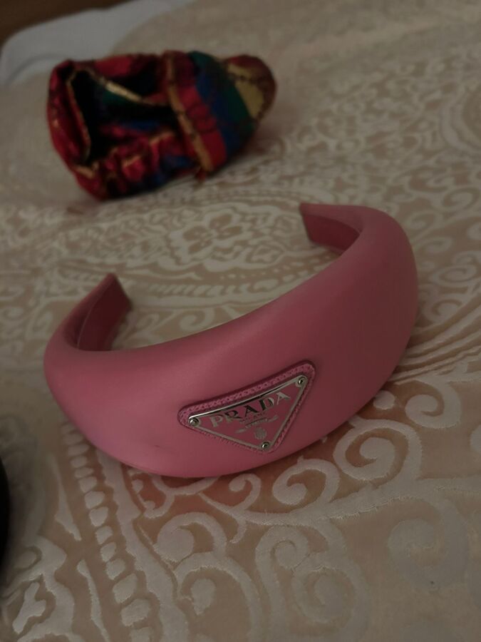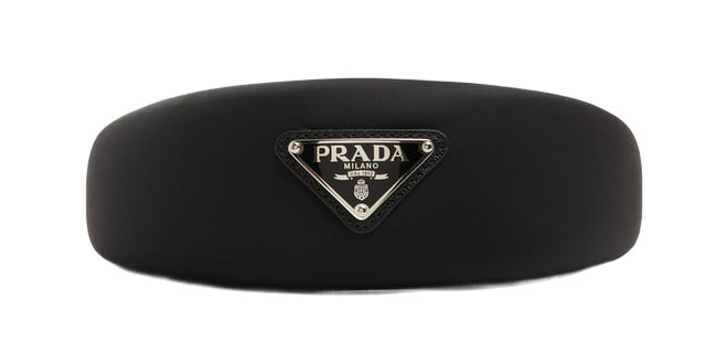Embrace elegance with the Prada Re-Nylon Triangle-Logo Headband from the AW22 collection! This oversized puffy headband is crafted from black Re-Nylon, a regenerated nylon yarn (ECONYL®) that combines style with sustainability. Featuring an enamelled metal triangle logo and a convenient slip-on design, it's hypoallergenic and nickel-free—perfect for a chic accessory that cares for the planet!