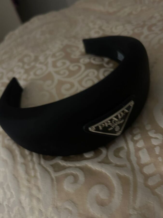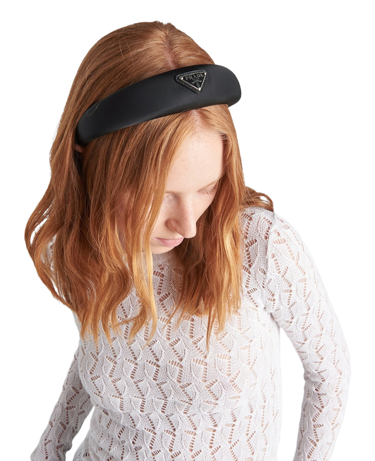 Embrace elegance with the Prada Re-Nylon Triangle-Logo Headband from the AW22 collection! This oversized puffy headband is crafted from black Re-Nylon, a regenerated nylon yarn (ECONYL®) that combines style with sustainability. Featuring an enamelled metal triangle logo and a convenient slip-on design, it's hypoallergenic and nickel-free—perfect for a chic accessory that cares for the planet!