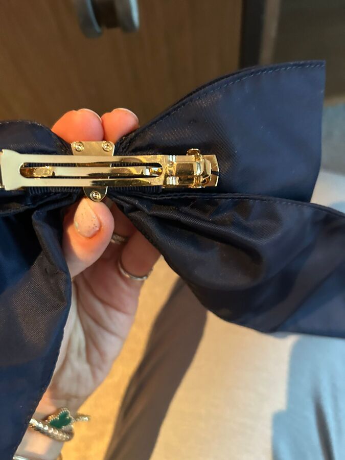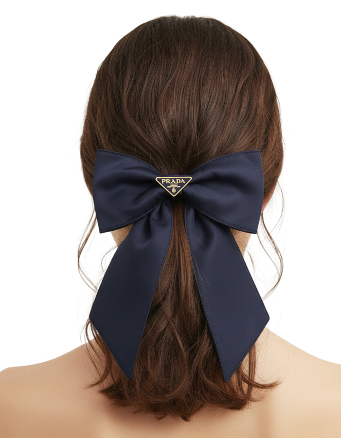 Add a touch of elegance with the Prada Re-Nylon Hair Clip! This chic accessory comes in sleek navy blue and features a stylish clasp fastening. Adorned with an enamel triangle logo and a fabulous oversized bow detail, it’s the perfect finishing touch for any hairstyle—because who doesn’t want a little designer flair?