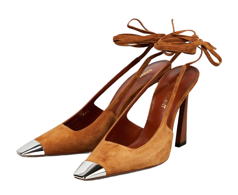 The Blade pumps from Saint Laurent are the ultimate show-stoppers! These sassy slingbacks feature chic wrap-around ankle straps and are crafted from sumptuous brown suede, topped with a dazzling silver-toned cap at the pointed toes. With a flirtatious 105mm heel and a luxe leather lining and sole, these beauties scream high fashion. Made in Italy, darling!