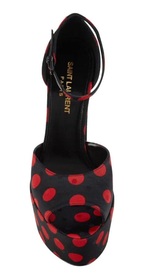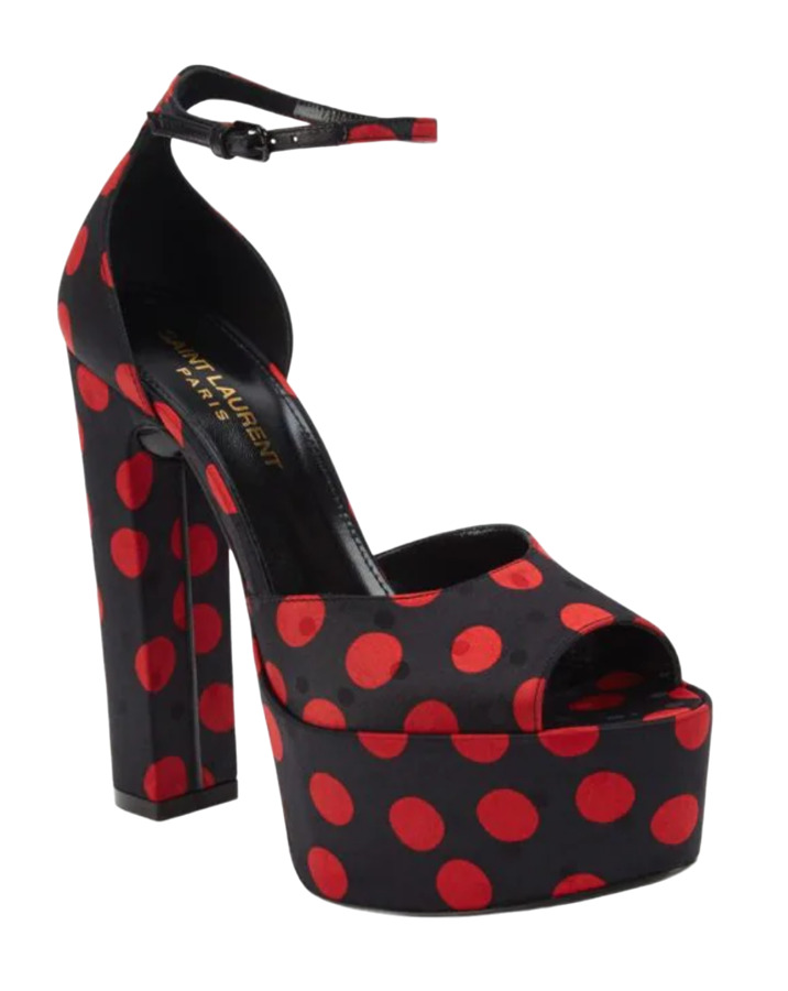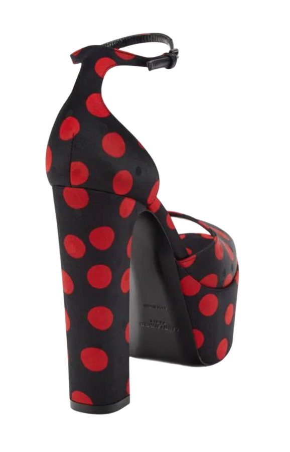 Add a touch of flair to your casual look with the Saint Laurent Polka Print Platform Heel Sandals. Featuring a playful polka dot print, an open toe, and a chic buckle closure, these Italian-made sandals are both stylish and comfortable. With a 4.5" heel and a 1.5" platform, they’re perfect for any occasion!