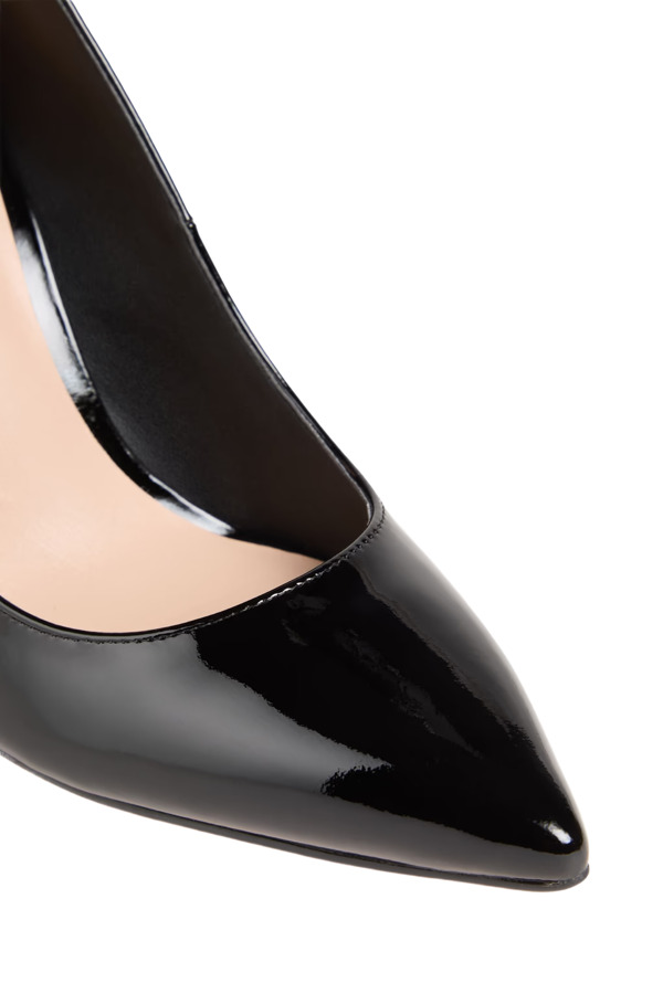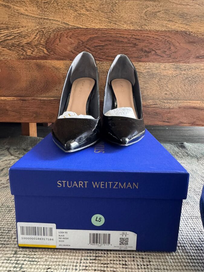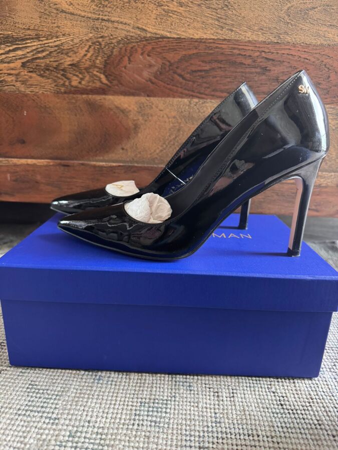 Step into luxury with the Stuart Weitzman Leigh 95 patent-leather pumps! Featuring a sleek pointed toe and a chic slip-on design, these pumps are adorned with a stylish logo embellishment for a touch of sophistication. The durable rubber sole ensures comfort and stability, while the glossy patent finish adds a wow factor to any outfit.