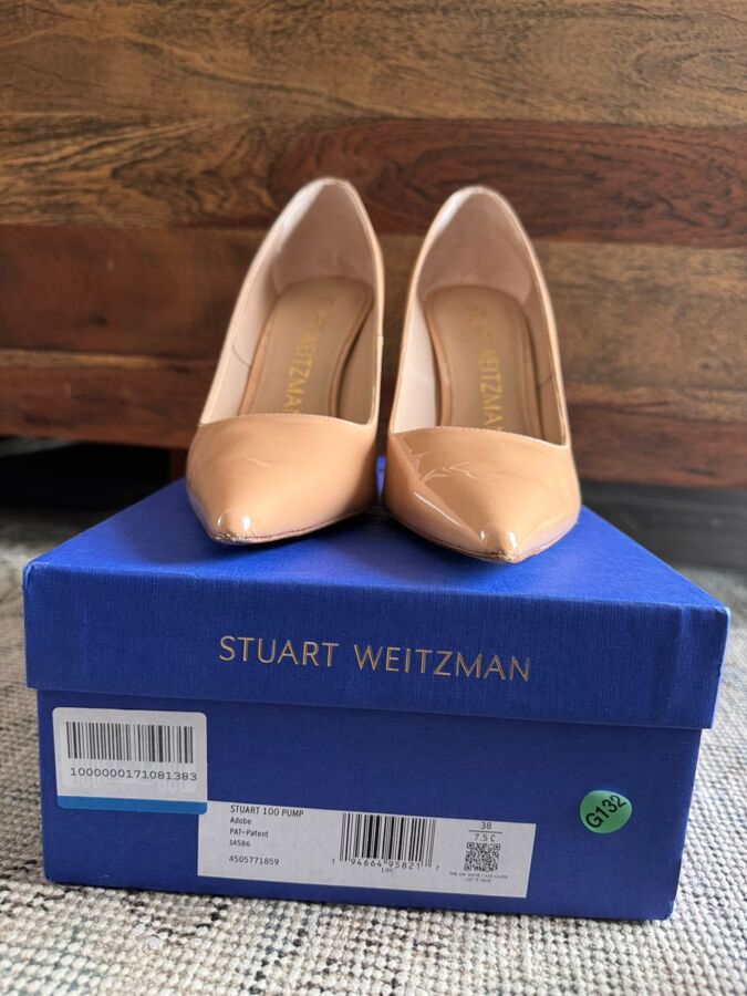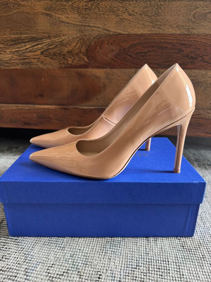 Elevate your ensemble with these stunning Stuart Weitzman patent-leather pumps! Featuring a sleek pointed toe and a classic slip-on design, these heels are the epitome of sophistication. Crafted from luxurious 100% calf-skin leather and finished with a supple leather sole, they are made in Spain for impeccable quality. Perfect for dressing up any outfit, these pumps are a must-have staple in your wardrobe!