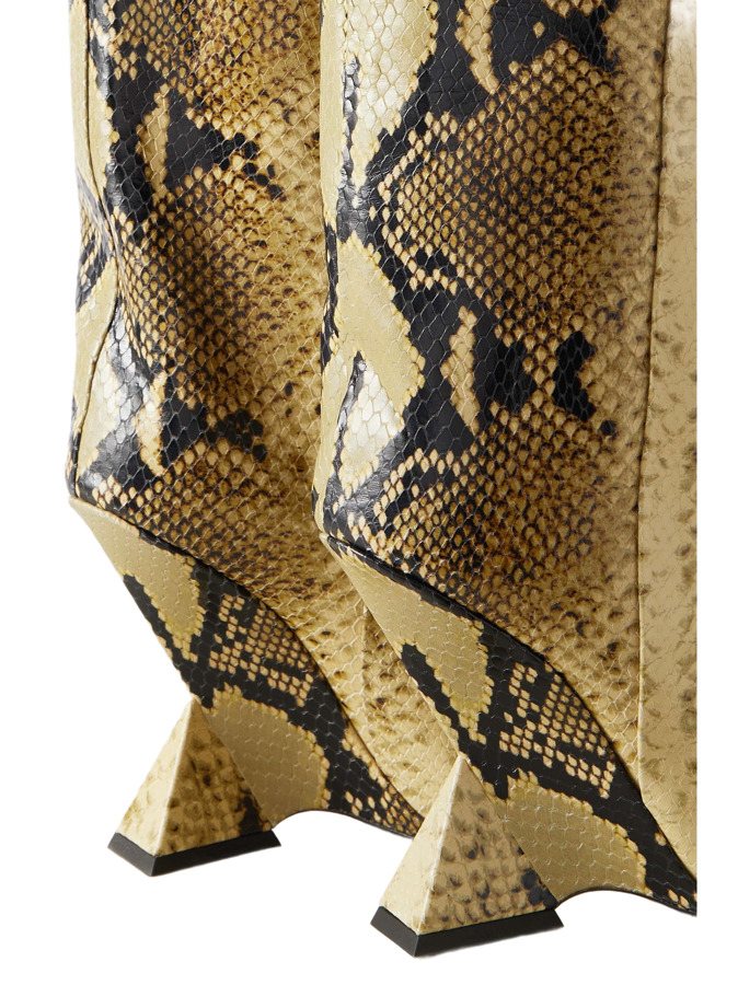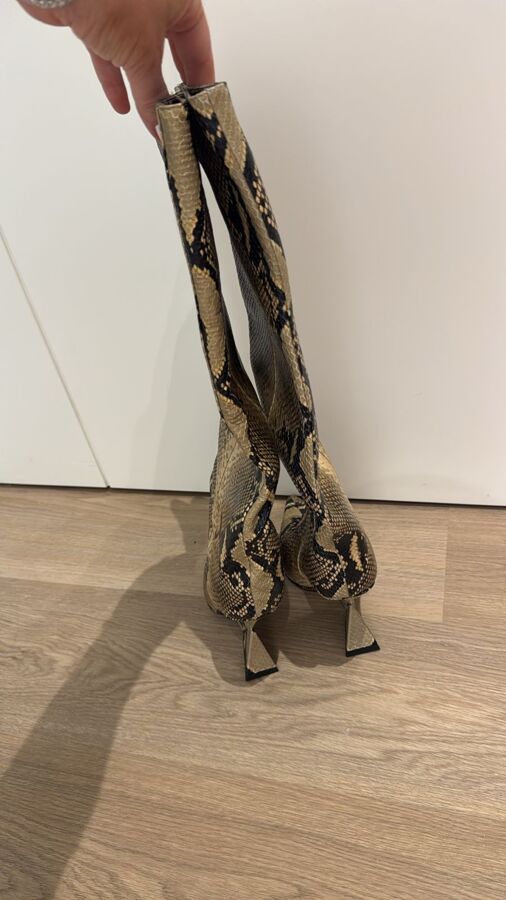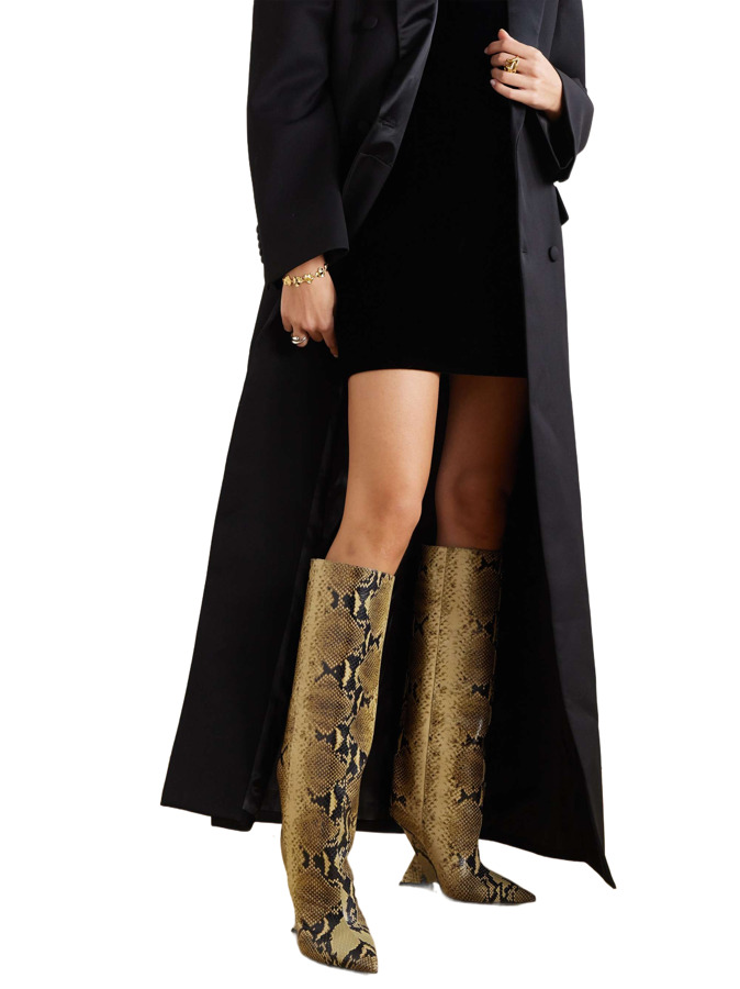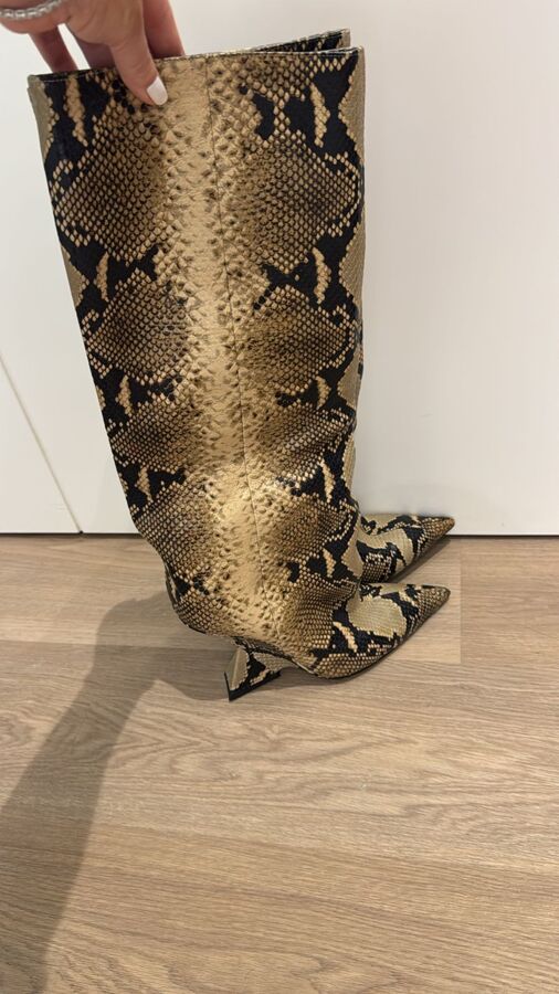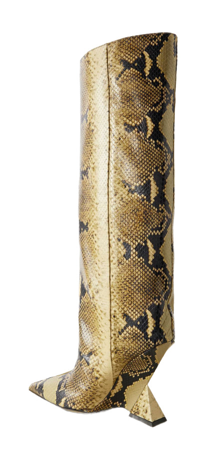Turn heads in The Attico's 'Cheope' knee boots! With a striking snake-effect pattern and luxurious leather, these boots define bold elegance. The sculptural heels elevate your style game, making every step a statement. Perfect for those who dare to stand out, these boots are not just an accessory—they're a fashion masterpiece!