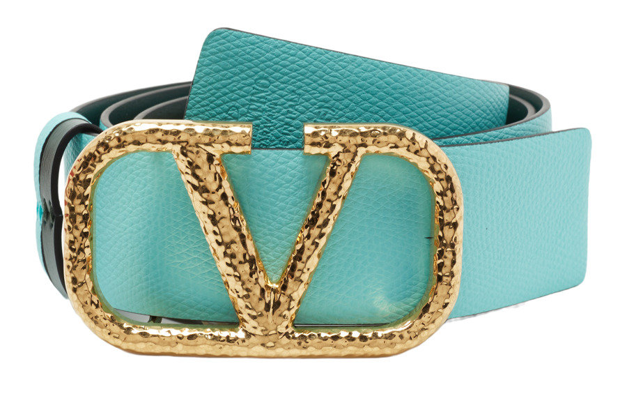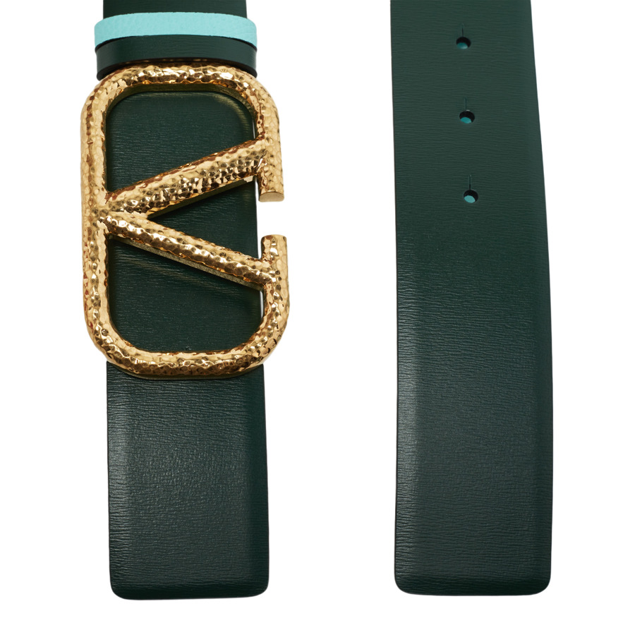 Elevate your accessory collection with this authentic Valentino belt, featuring a sleek reversible design in blue and green leather. The statement piece is adorned with a signature VLogo buckle in gold-tone metal, offering a touch of luxury and versatility. Perfect for enhancing any outfit, this belt seamlessly combines style and function, making it an essential staple for fashion enthusiasts.