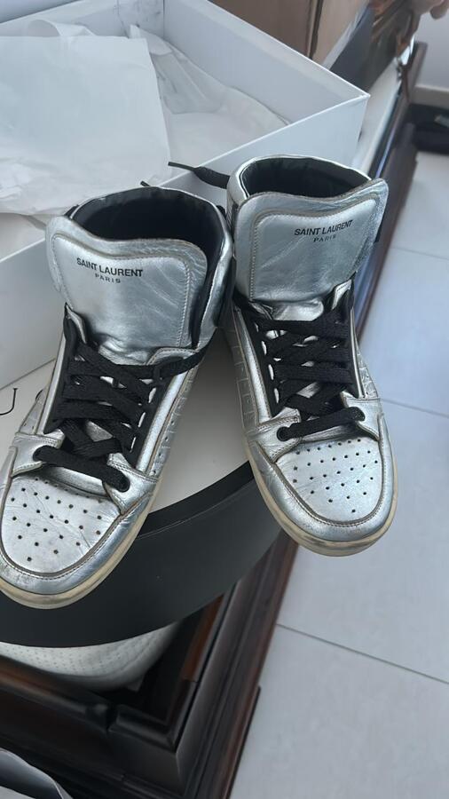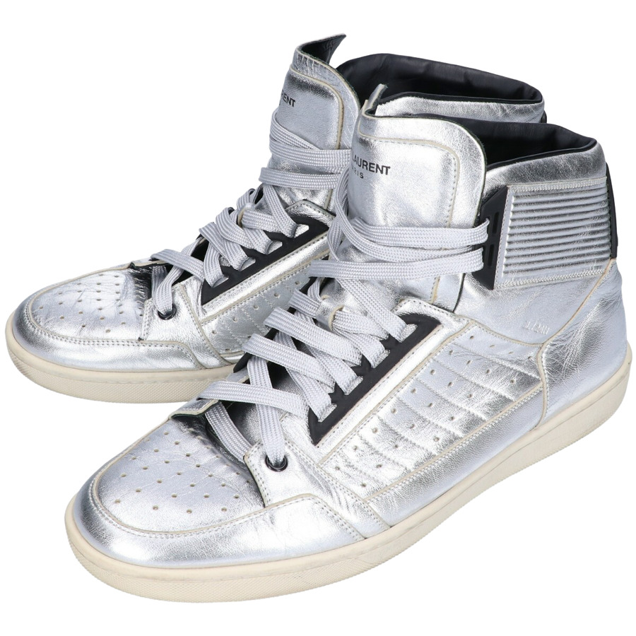 The Leather Court Classic Metallic Pack by Saint Laurent adds a flashy twist to the classic basketball-inspired silhouette. Crafted from premium leather, the high-top sneakers showcase a metallic silver hue with black accents. A toned off-white midsole offers a rustic, worn appearance, completing this stylish and nostalgic design. Perfect for those seeking both elegance and streetwear flair.
