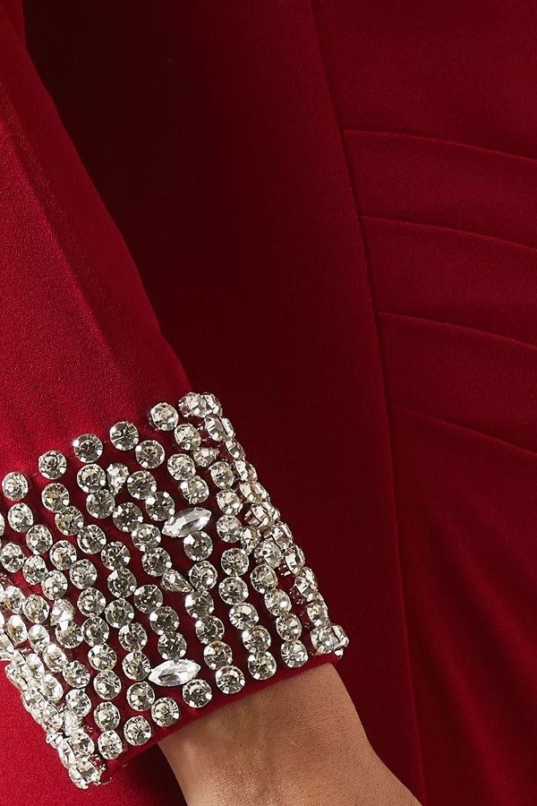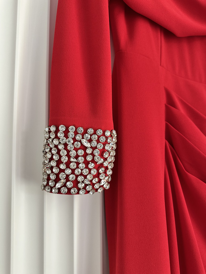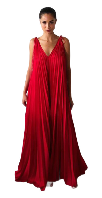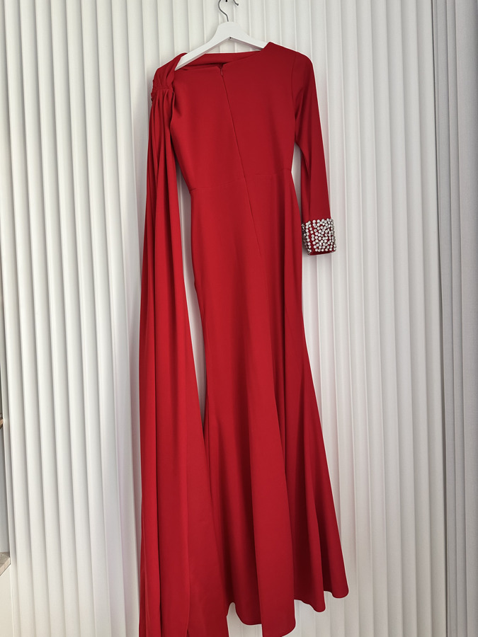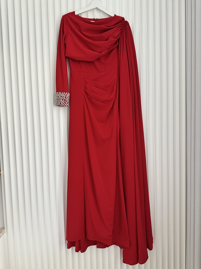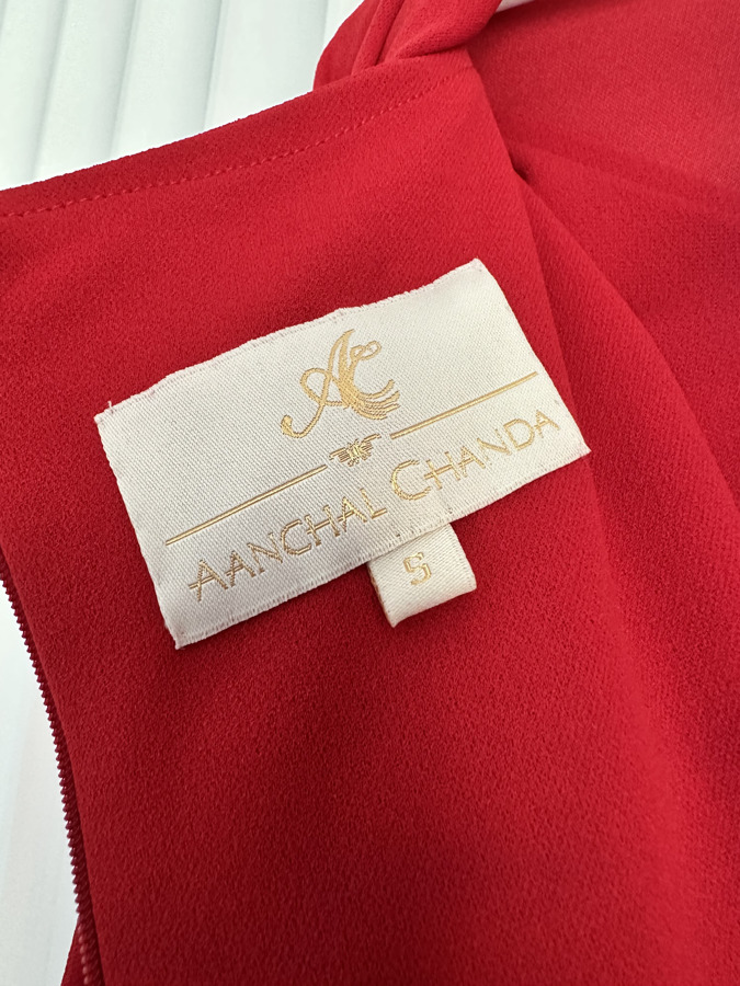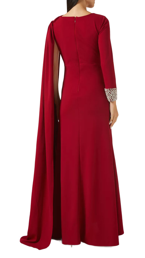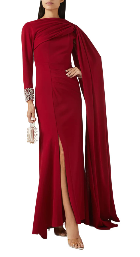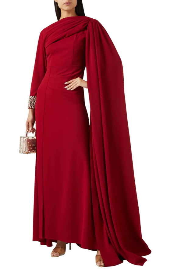 This Ac By Aanchal Chanda dress showcases a flowing cape that moves gracefully, perfectly complementing a precisely draped neckline for a flattering silhouette. Long sleeves with embellished cuffs add refinement while ensuring ease of movement. Featuring a concealed back zip and a thigh-high slit for practicality, the floor-sweeping length allows versatile styling with any footwear. Perfect for making a statement!