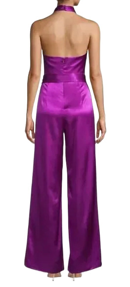 Make a statement in this stunning magenta satin halter jumpsuit by Aidan Mattox. With a draped cowl neckline and wide-leg silhouette, it offers a silky smooth finish that's perfect for glamorous nights out or formal events. The rich jewel tone exudes luxury, while the flowy fit beautifully flatters every curve, making it a standout choice for any occasion.