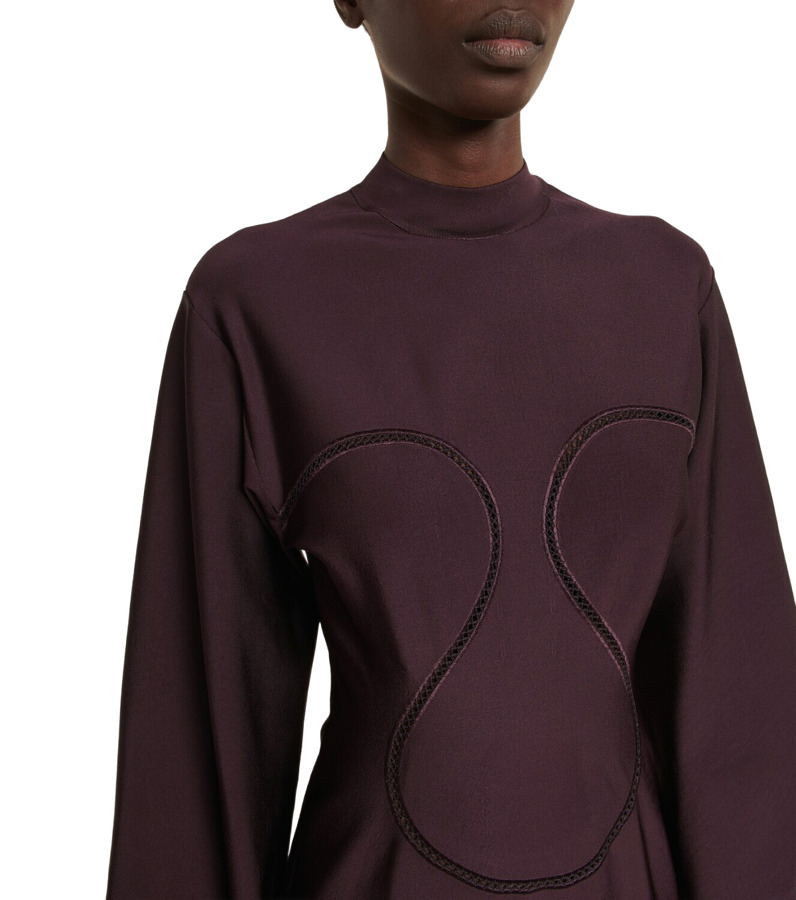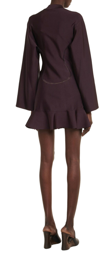 Turn heads in Alaïa’s ruffle-trimmed minidress. Crafted in Italy from shiny stretch viscose, this sleek mini features contouring open lace detailing along the bodice, a cinched waist, and a flirty ruffle hem. Designed to hug in all the right places, it’s a statement piece made for unforgettable nights.