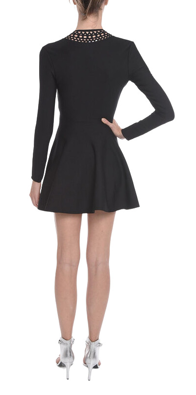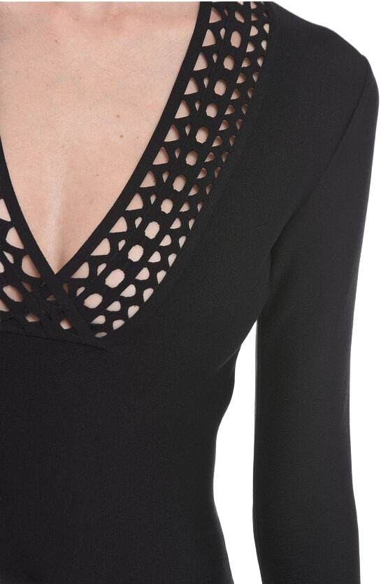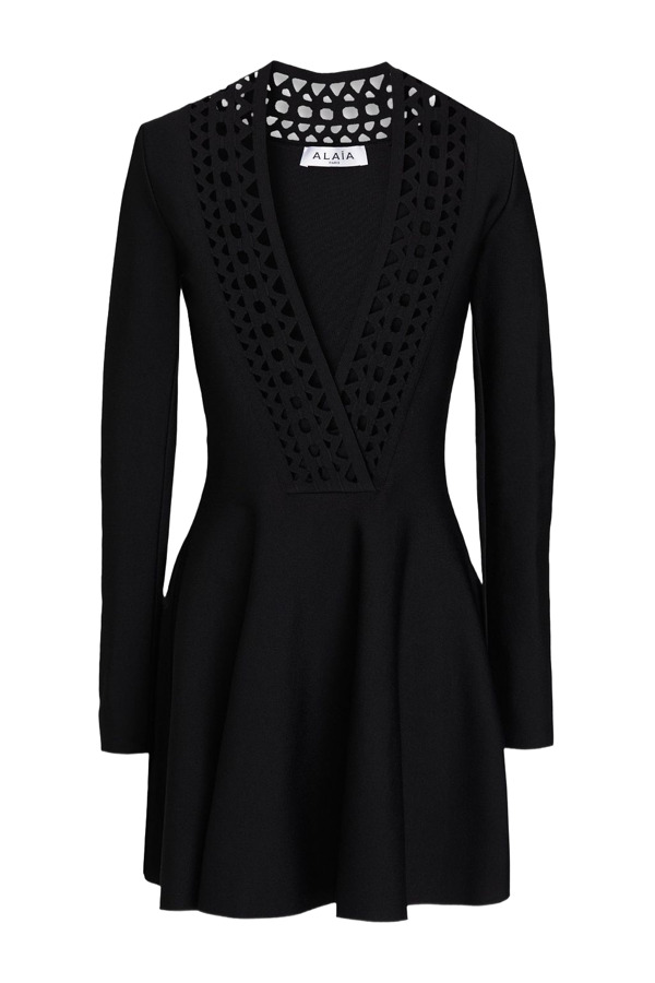 Sculpted and striking, the Alaïa Vienne V-Neck mini dress is crafted from midweight stretch ponte with laser-cut geometric detailing for a flawless fit. Featuring a fluted hem, concealed side zip, and gusset snap closure, this iconic knit mini dress delivers signature Alaïa precision with modern, body-contouring allure.