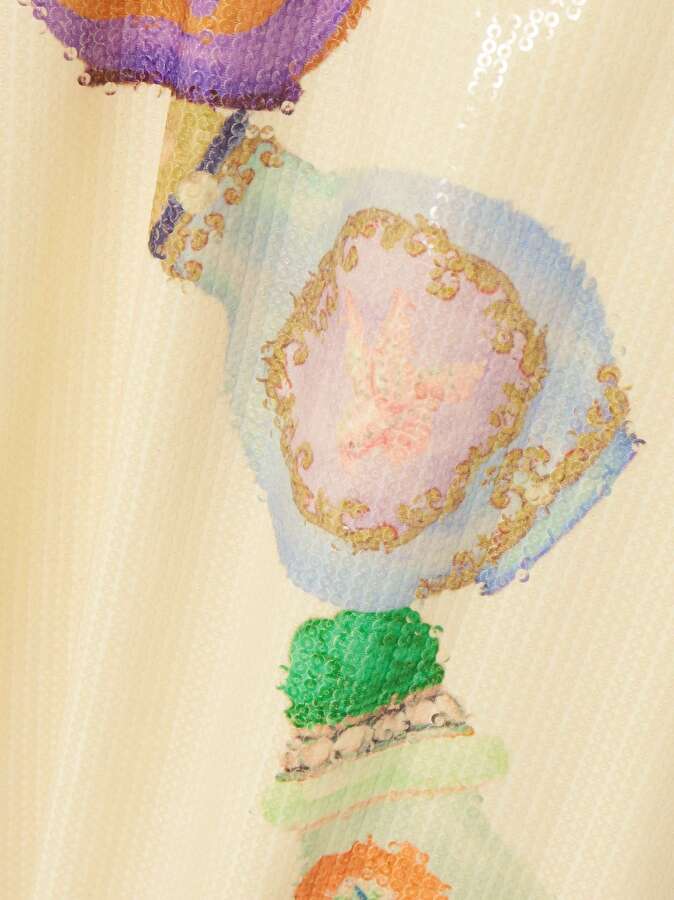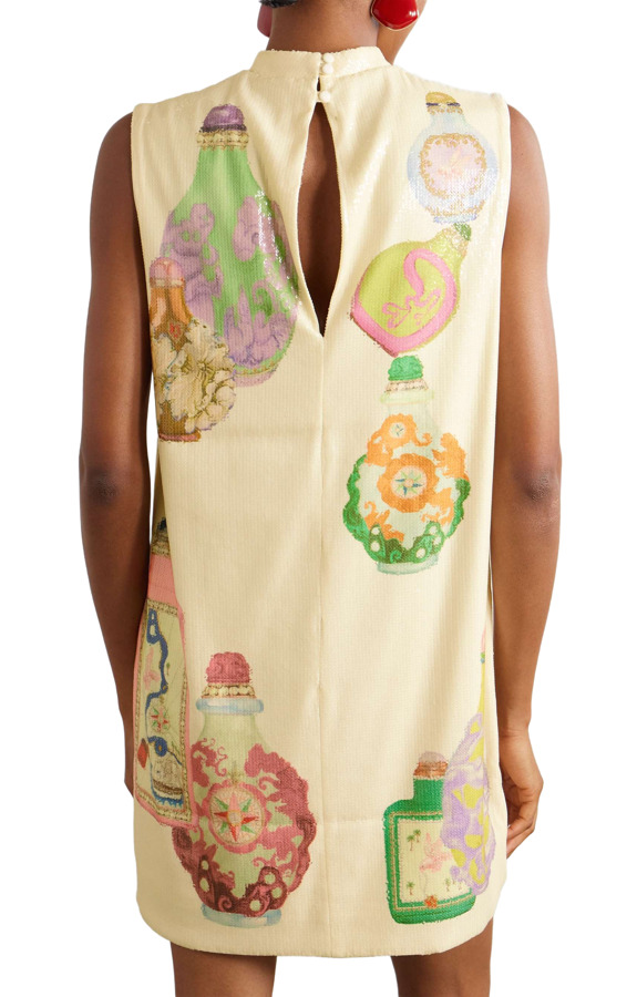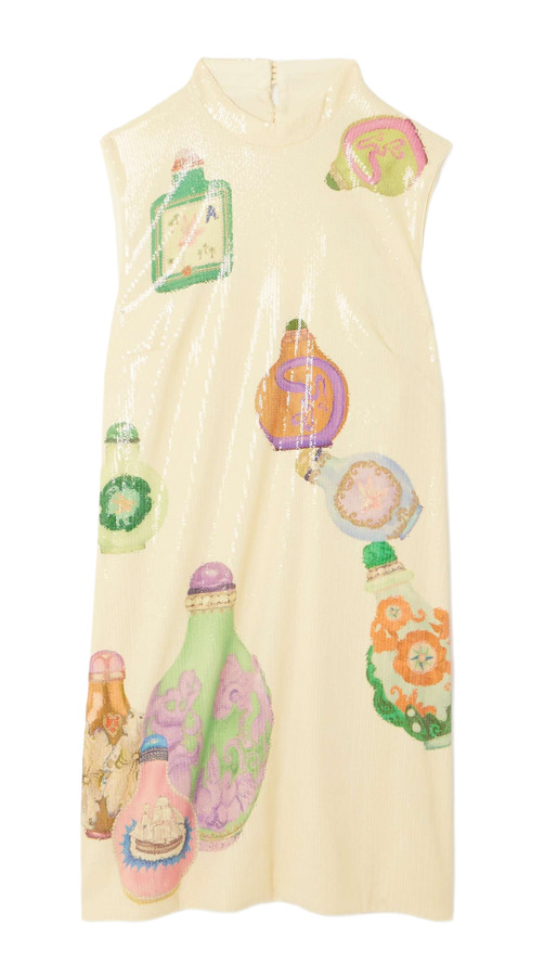 Discover playful glamour with ALÉMAIS’ nostalgic mini dress, printed with relic bottle illustrations by artist Chesca Athas. Crafted from sequined crepe, this easy shift silhouette sparkles effortlessly, finished with a chic keyhole back. Vibrant, artful, and full of personality—it’s a statement piece that turns everyday beauty into party magic.