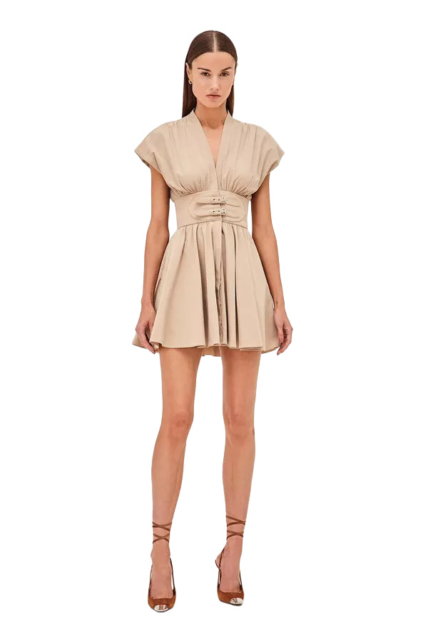 The Alexis Bardello Dress in Tan is crafted from a comfortable blend of 53% cotton, 43% viscose, and 4% elastane. This unlined dress features a front button closure and an attached waist belt for a flattering silhouette. With practical side slip pockets, it combines style and functionality, making it perfect for everyday wear or casual outings.
