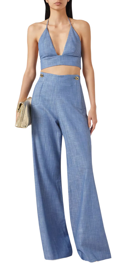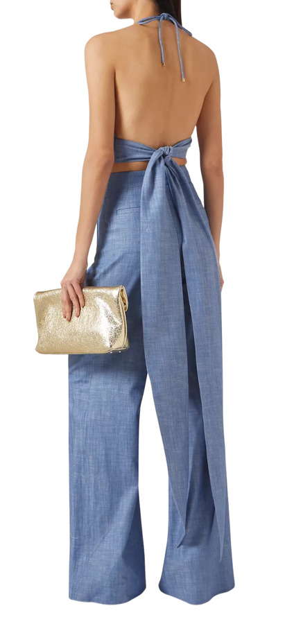 Step into summer with the Riza Top by Alexis and Neale Chambray Pants! The lightweight chambray top flaunts a plunging neckline and halterneck with a sassy tie, while the wide-leg pants feature gold-tone buttons at the high waist. Together, they create a chic ensemble that's perfect for turning heads on sunny days!