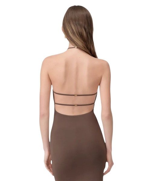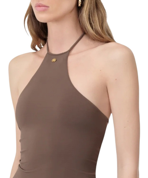 This elegant top stands out with the minimalist design and figure-hugging silhouette it has. Crafted from smooth stretch fabric, it offers both comfort and a refined fit. The thin strap detail and small brand logo at the chest add a sophisticated touch. A versatile piece, it can be styled effortlessly with skirts or trousers for chic, modern looks.