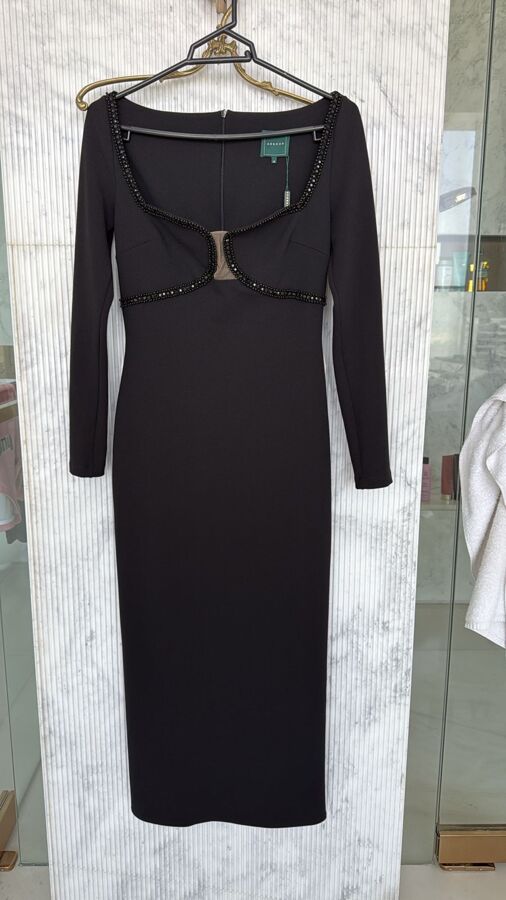 The ARBOUR Maxi Black Dress features intricate stud detailing on the bust, making it a stunning choice for any special occasion. With its elegant silhouette and timeless black hue, this dress combines sophistication and modern flair, ensuring you stand out at weddings, galas, or any festive gathering. Embrace effortless chic with this captivating piece!