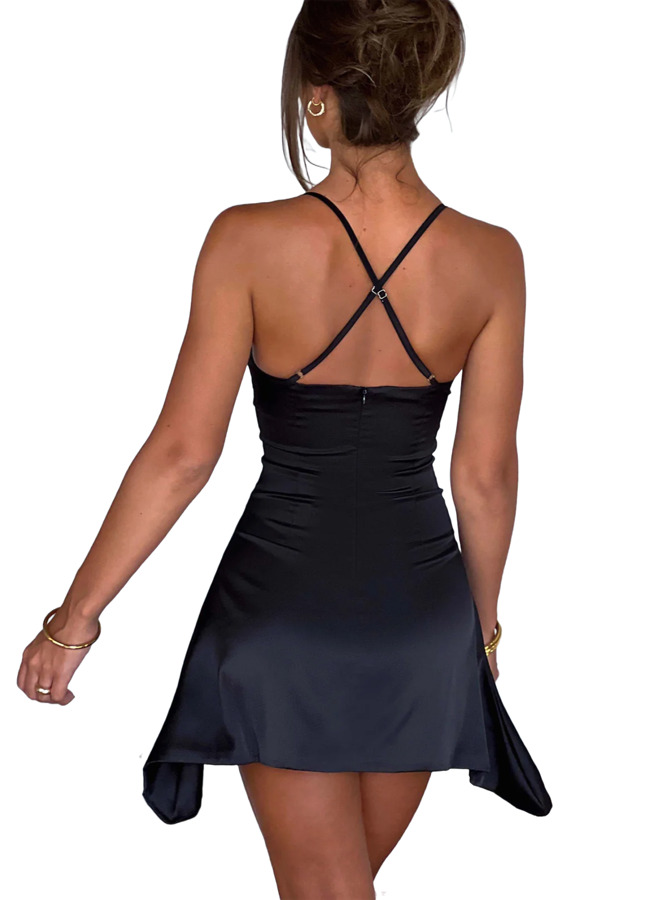 Clarise is bringing the drama in satin! A body-hugging fit with pleated plunge cups, cross-back straps, and flirty side ruffles—this dress is pure party fuel. She’s girly, glossy, and made for heels, waves, and nights that don’t end early.