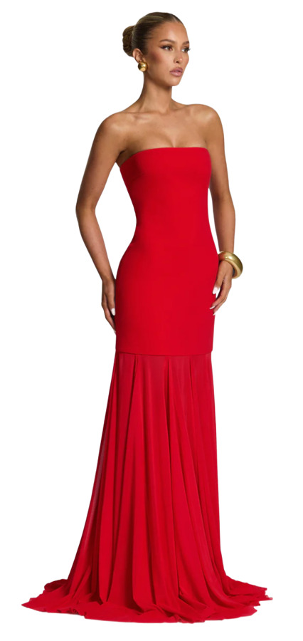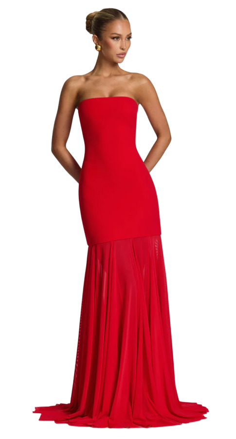 The Merritt Gown in red exudes modern elegance. A strapless neckline and body-hugging longline stretch-crepe bodice sculpt the figure, finished with internal grip tape for support. A semi-sheer mesh skirt with flowing godets creates graceful movement to full length. Fully lined with an invisible back zip, it’s designed for statement evenings and formal occasions that demand confidence and drama always.