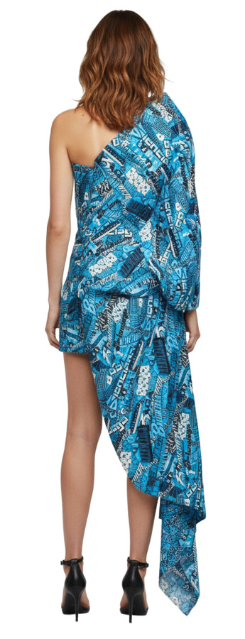 This stunning Balenciaga evening gown from the Spring/Summer 2019 collection by Demna Gvasalia features a vibrant blue print and a striking one-shoulder design. With long sleeves and a concealed zip closure at the side, it offers an elegant silhouette perfect for formal events. Make a memorable entrance in this show-stopping piece!