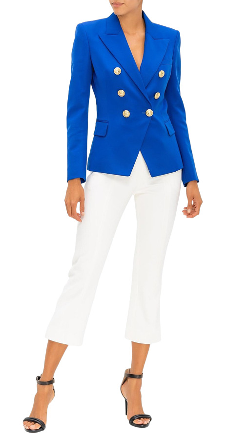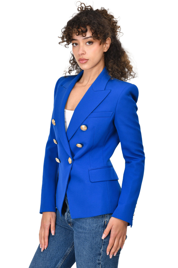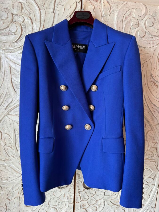 The Balmain Royal Blue Wool Double-Breasted Blazer exudes luxury and sophistication. With its padded shoulders and front button closures, this blazer offers a structured, tailored fit. The interior is fully lined for comfort and refinement, making it an ideal choice for elevating any outfit. Perfect for both professional and stylish casual looks, this piece is a timeless addition to your wardrobe.