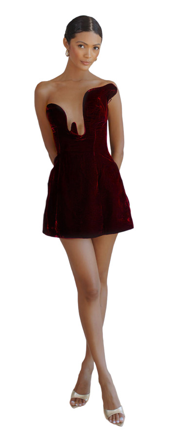 The ROSALYN Hourglass Mini Dress is a sculptural, statement piece crafted from rich, plush burgundy velvet. With a dramatic curved bodice and deep plunge, it beautifully frames the décolletage, highlighting your natural shape. The structured waist cinches elegantly, transitioning into a soft A-line mini skirt that shimmers with subtle shine and depth, ensuring you command the room wherever you go.