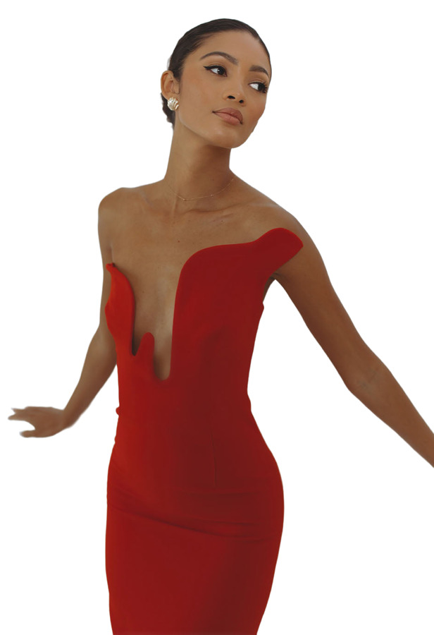 The Rosalyn Midi Dress in Fire Red is a stunning strapless piece featuring a unique abstract front wire design and boning through the bodice for structure. This chic midi length dress showcases a back split for added allure and includes a center back exposed metal zipper. Fully lined for comfort, it’s perfect for making a bold statement at any event!