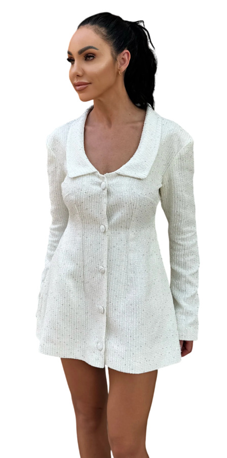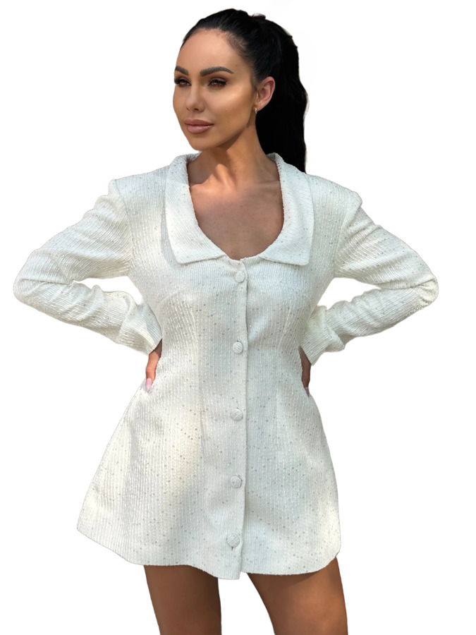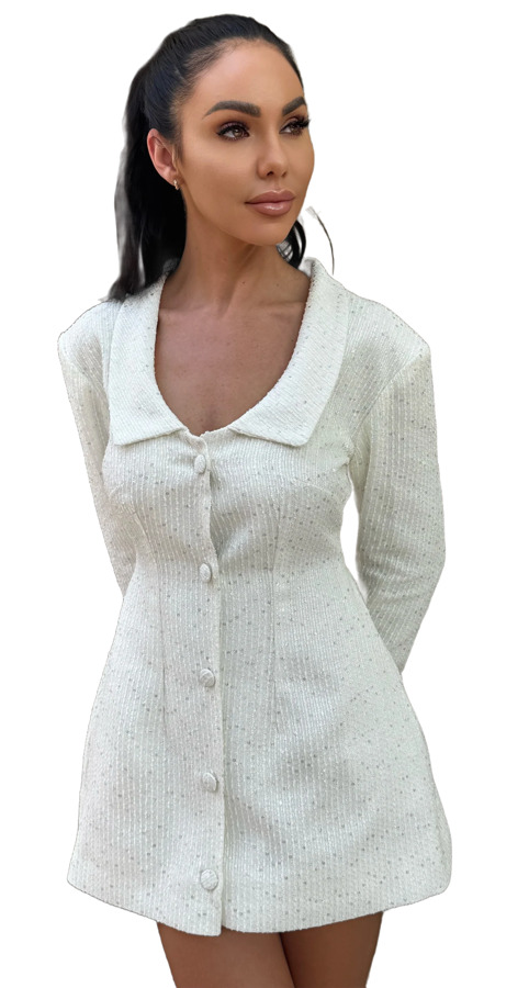 Step into winter magic with the Snowfall Coat Dress. This ivory white mini features subtle sequin shimmer, a tailored silhouette, structured collar, and delicate button detailing. Elegant yet festive, it’s perfect for Christmas dinners, winter soirées, and New Year’s Eve celebrations—timeless glamour with a soft, snowy glow.