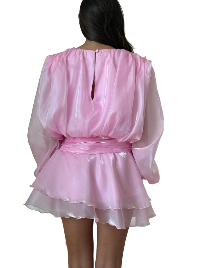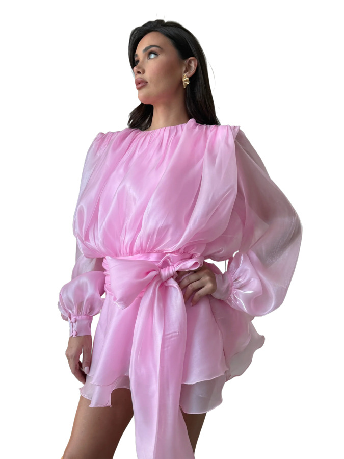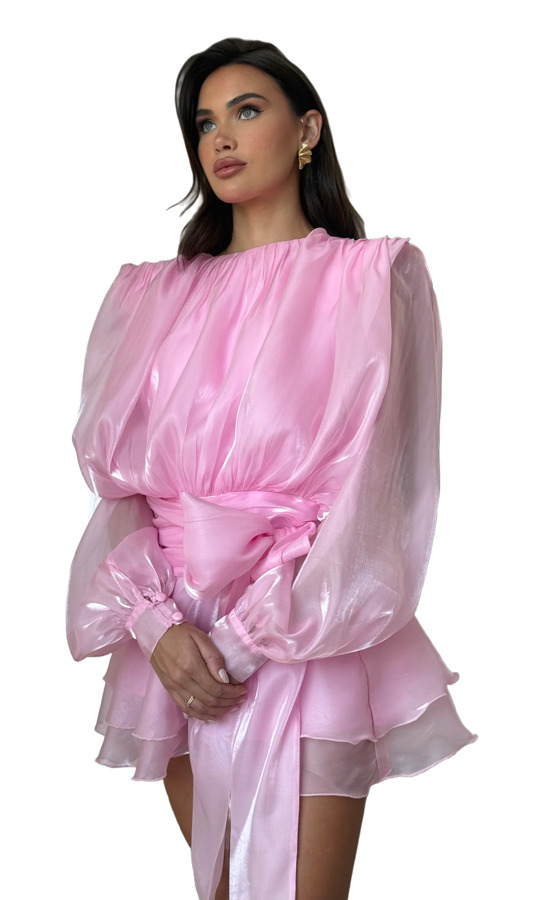 Float through the day in this Belle Chose blouse-dress, where romance meets effortless ease. Crafted from a bubble pink tone fabric, it features delicate pleats, a gathered tie neckline, cinched waist, and playful ruffle hem. With draped long sleeves and graceful movement, it’s perfect for brunch dates, summer evenings, and elevated everyday style.