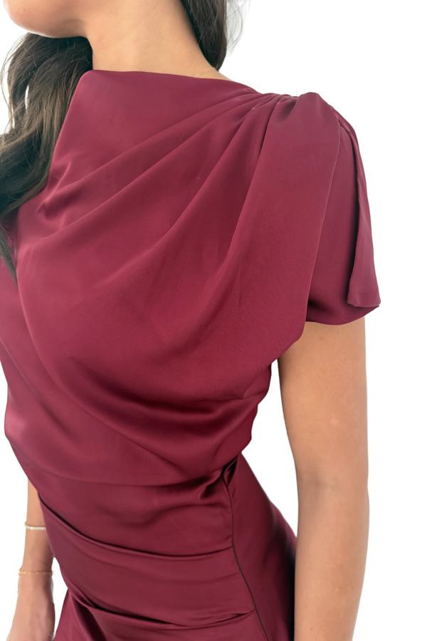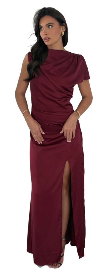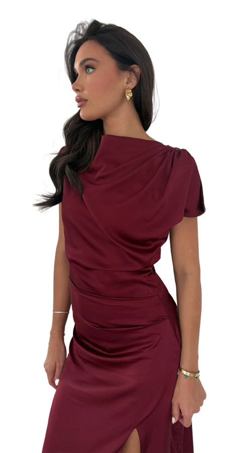 Slip into effortless glamour with The Noelle Satin Drape Dress. Crafted from luminous satin in a chic burgundy hue, this elegant column dress features a softly draped neckline, flattering ruched waist, and a sultry high side slit. Fully lined with an invisible back zip, it’s perfect for weddings, celebrations, and elevated evening events.