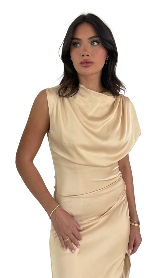 Slip into effortless glamour with The Noelle Satin Drape Dress. Crafted from luminous satin in a chic champagne hue, this elegant column dress features a softly draped neckline, flattering ruched waist, and a sultry high side slit. Fully lined with an invisible back zip, it’s perfect for weddings, celebrations, and elevated evening events.