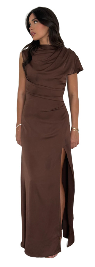 Slip into effortless glamour with The Noelle Satin Drape Dress. Crafted from luminous satin in a chic chocolate brown hue, this elegant column dress features a softly draped neckline, flattering ruched waist, and a sultry high side slit. Fully lined with an invisible back zip, it’s perfect for weddings, celebrations, and elevated evening events.