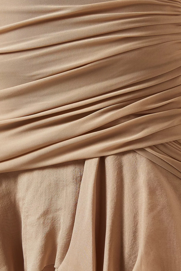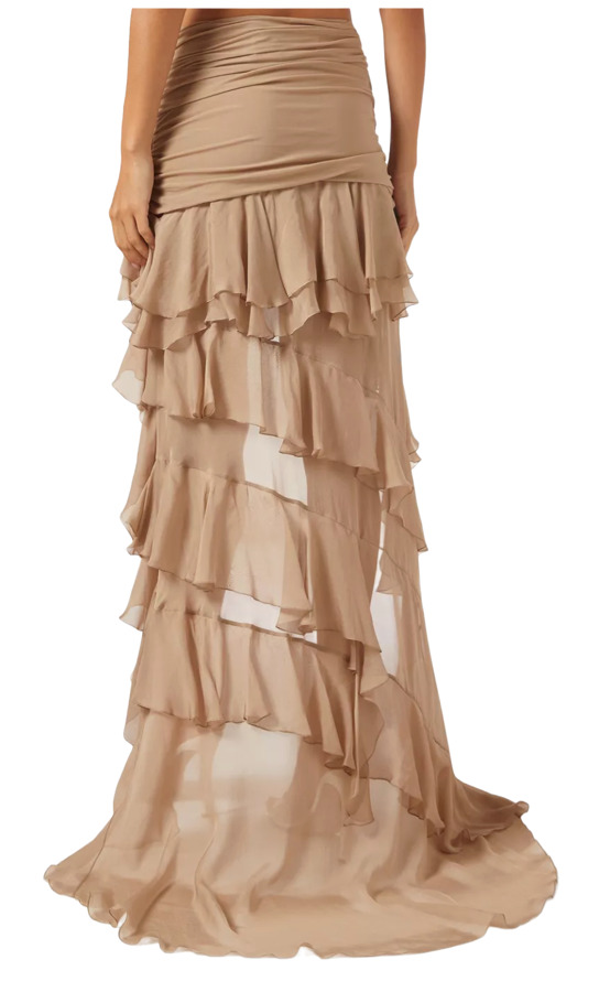 Blumarine’s ruffled maxi skirt brings striking elegance to any occasion. Crafted from lightweight silk chiffon, it features an elasticated, ruched waist and cascading tiers for dramatic volume. A high-low hem and sweeping train create fluid movement, ensuring a sophisticated, head-turning silhouette.