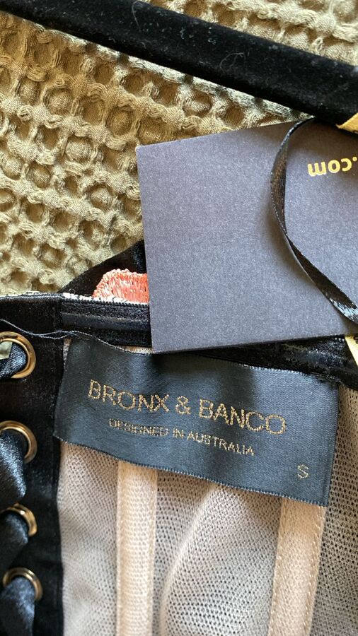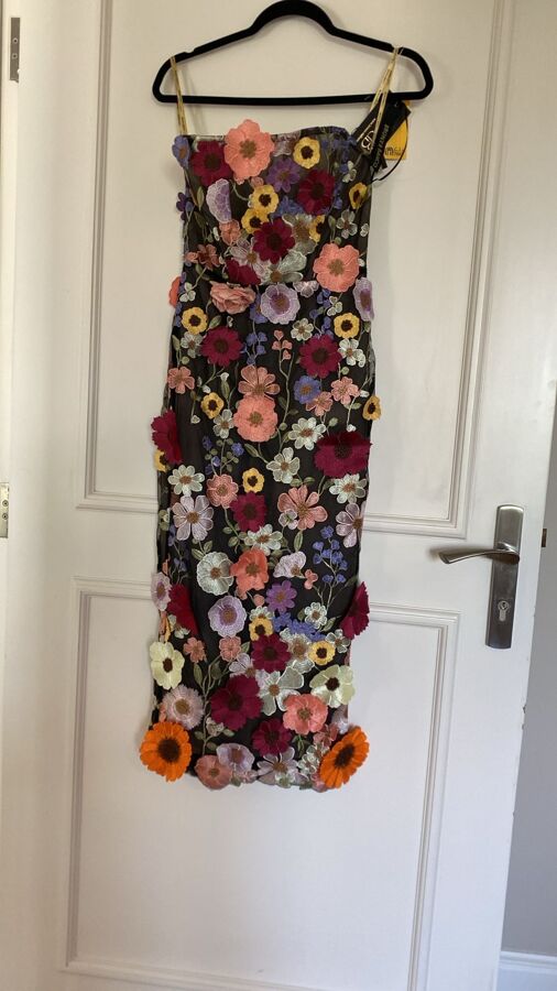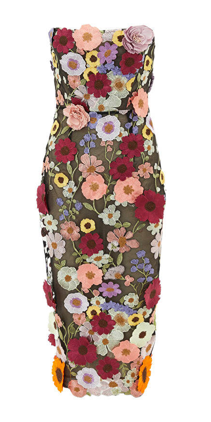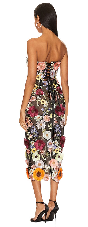 Bloom in Bronx and Banco’s Bouquet Dress: a fully lined, boned-bodice beauty in sheer mesh sprinkled with floral appliqués. The structured corsetry sculpts while delicate blooms float across the fabric, finished with a hidden back zipper for a seamless fit. Feminine, flirty, and utterly frame-stealing.