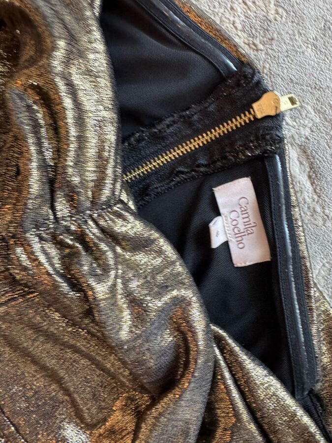 The Camila Coelho Leandra Off Shoulder Top features unpadded underwire support, an exposed back zipper, and a rosette detail at the bust. Paired with the Leandra Maxi Skirt, which has a hidden back zipper and vent, this ensemble offers a chic, coordinated look. The skirt measures approximately 42 inches in length.