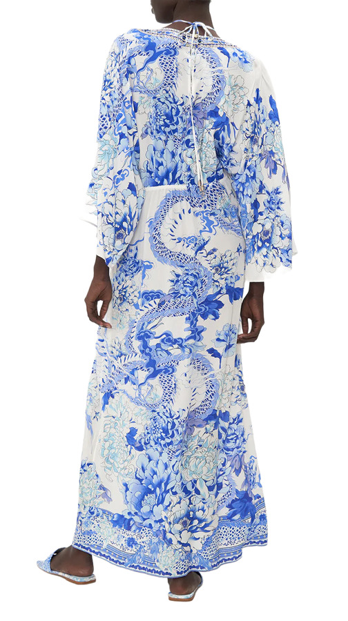 The Heart Of A Dragon Drawcord Detail Dress immerses you in royal blue hues, featuring vibrant botanica and enchanting dragon dreamscapes. Made from signature CAMILLA silk, this luxury dress boasts dainty statement sleeves that flare elegantly, hand-embellished crystals, and a relaxed maxi silhouette with a drawcord accent. Inspired by the dragon's supernatural power, this handcrafted piece celebrates untamed beauty, making it a stunning addition to any wardrobe. Designed in Australia, it's perfect for those who embrace luxury and style.