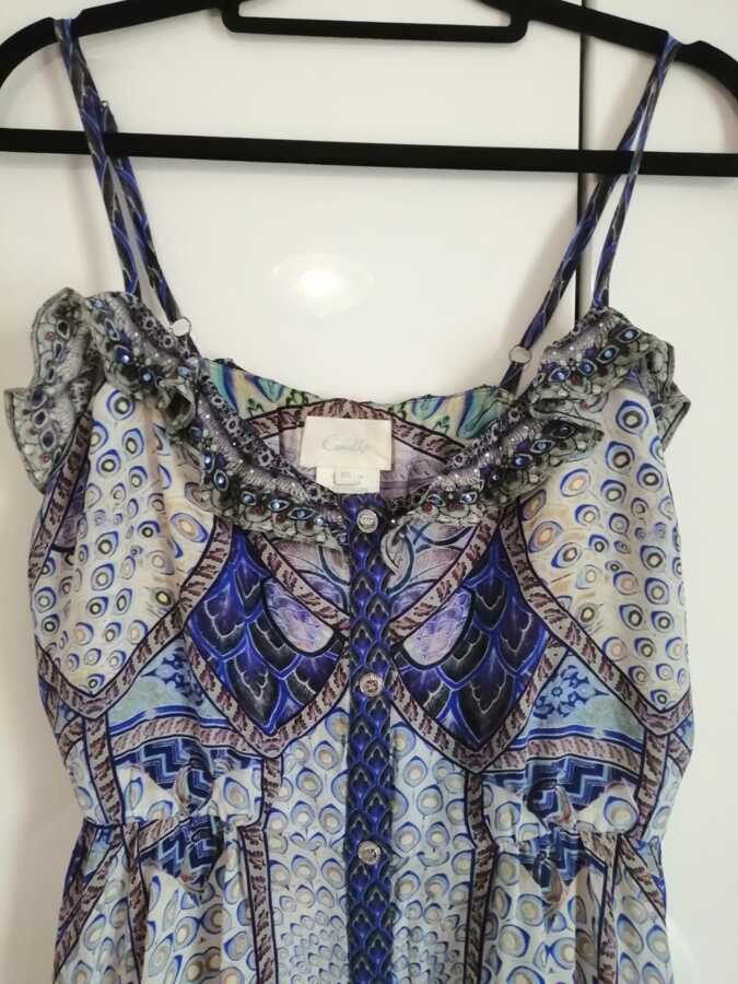 This exquisite dress is made from 100% silk and features crystal-embellished accents for a touch of glamour. With a front button closure and a belted waist, it offers a flattering fit. Adjustable shoulder straps ensure comfort, while the unlined design adds a light, airy feel.
