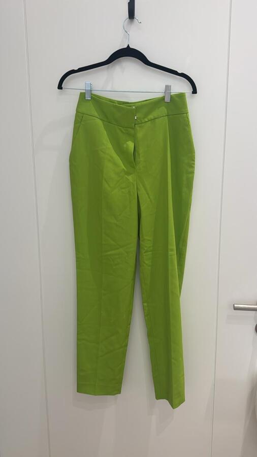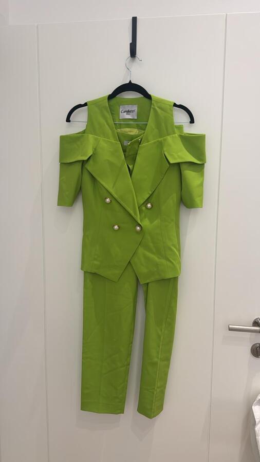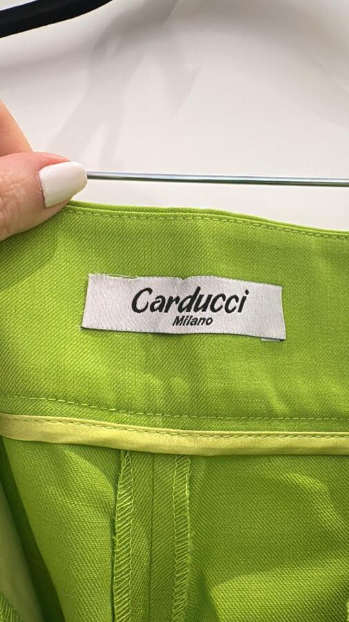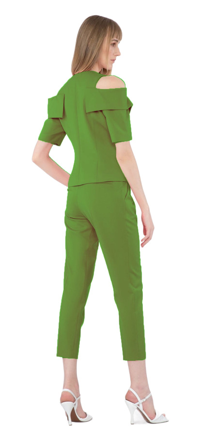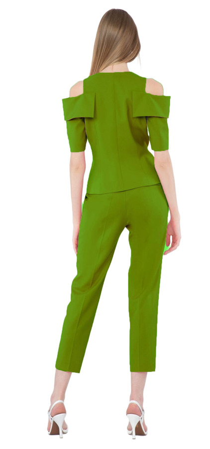The Carducci Milano trouser set is a bold green ensemble featuring an off-the-shoulder top with structured sleeves and double-breasted detailing. The tailored trousers are fitted and cropped at the ankle, creating a chic, modern look. This combination effortlessly balances elegance and contemporary style, making it a standout choice for any occasion.